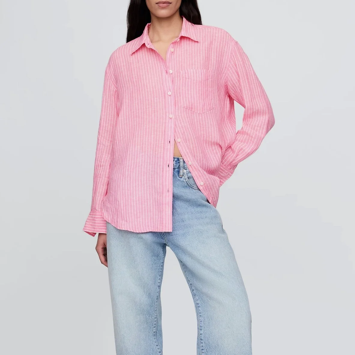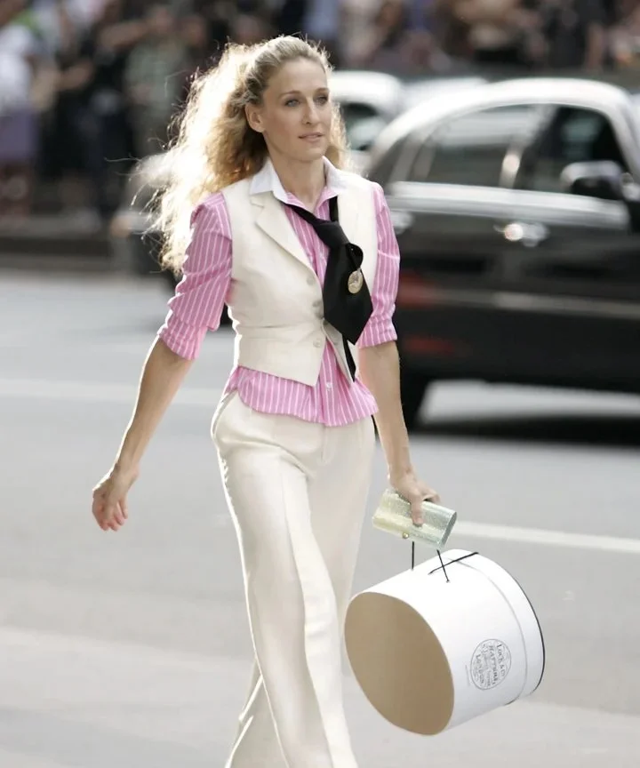 Ugh, the tailoring. Luckily we’re living through a real vest moment where we can recreate this iconic look without a trip to Ralph Lauren (where Carrie got hers). This creamy vest set looks gorj on every shape, nipping the waist with lots of elongating space in the leg. And the linen is perfect for summer.