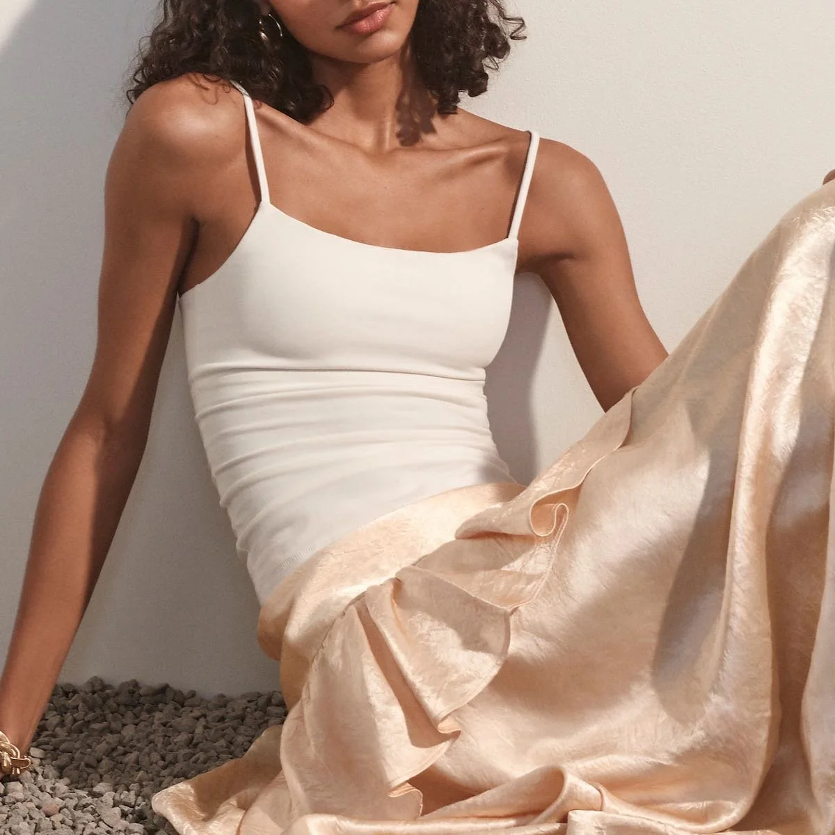 This look is so effective but it actually comprises 3 very simple elements. It starts with this tank - another one we own in every color, it’s so damn flattering.