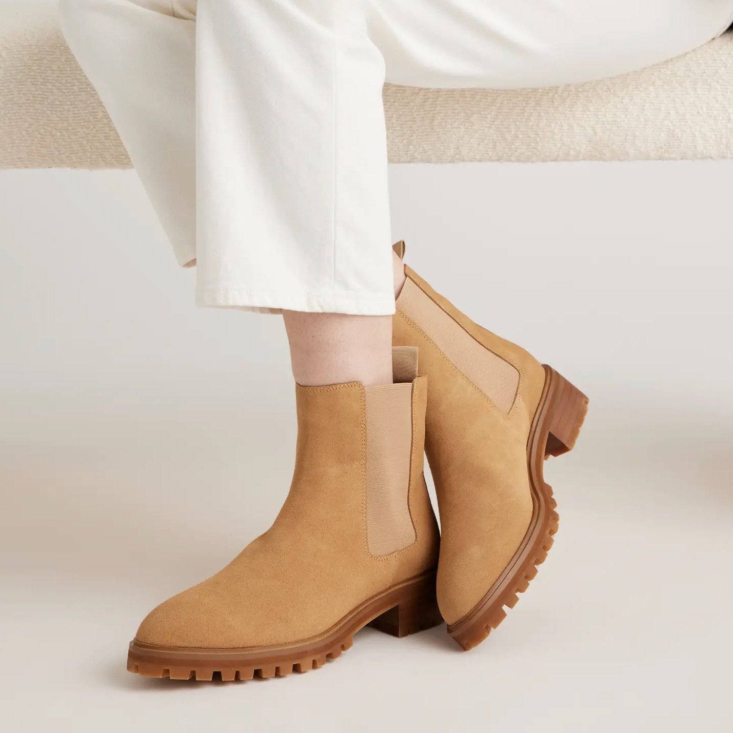Kind of a textbook perfect fall boot. They’re made of 100% water repellent suede leather yet are a third of the price of many comparable boots out there. The ankle height is juuust right for all our cropped pants and jeans where so many other shoes end up looking odd and out of place. They come in 3 perfect colors, but we like the softness of desert or the warmth of cinnamon for fall.