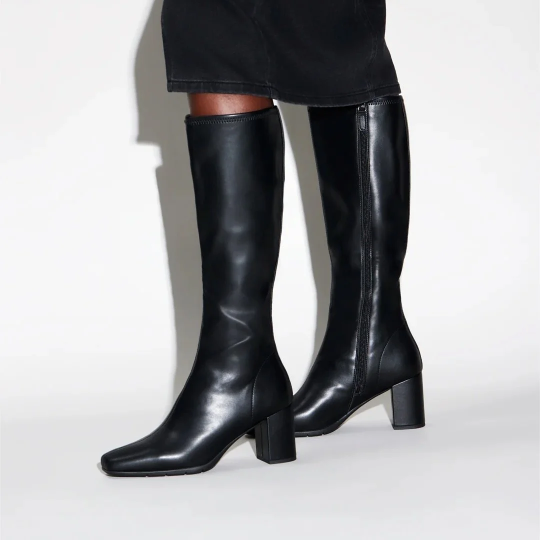 Give yourself a few seconds to just take in the glorious shape. All the proportions of these boots are exactly right. Not too skinny, not too clunky, which means they’ll never go out of style. Ok, now we get to the good stuff. They have a comfy block heel so we feel supported and can actually walk in them without pain. And they come in wide calf so we don’t have to squeeze.