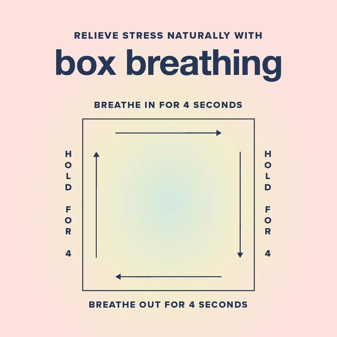 Breathing exercises have been incredibly effective at calming our nervous system. Some studies have even shown breathwork techniques like “cyclic sighing,” which we wrote about HERE, to have a greater improvement on mood and reduction in respiratory rate than mindfulness meditation. That said, here is a super simple formula to remember called box breathing that we can do any time to relieve stress. Just follow the below pattern.