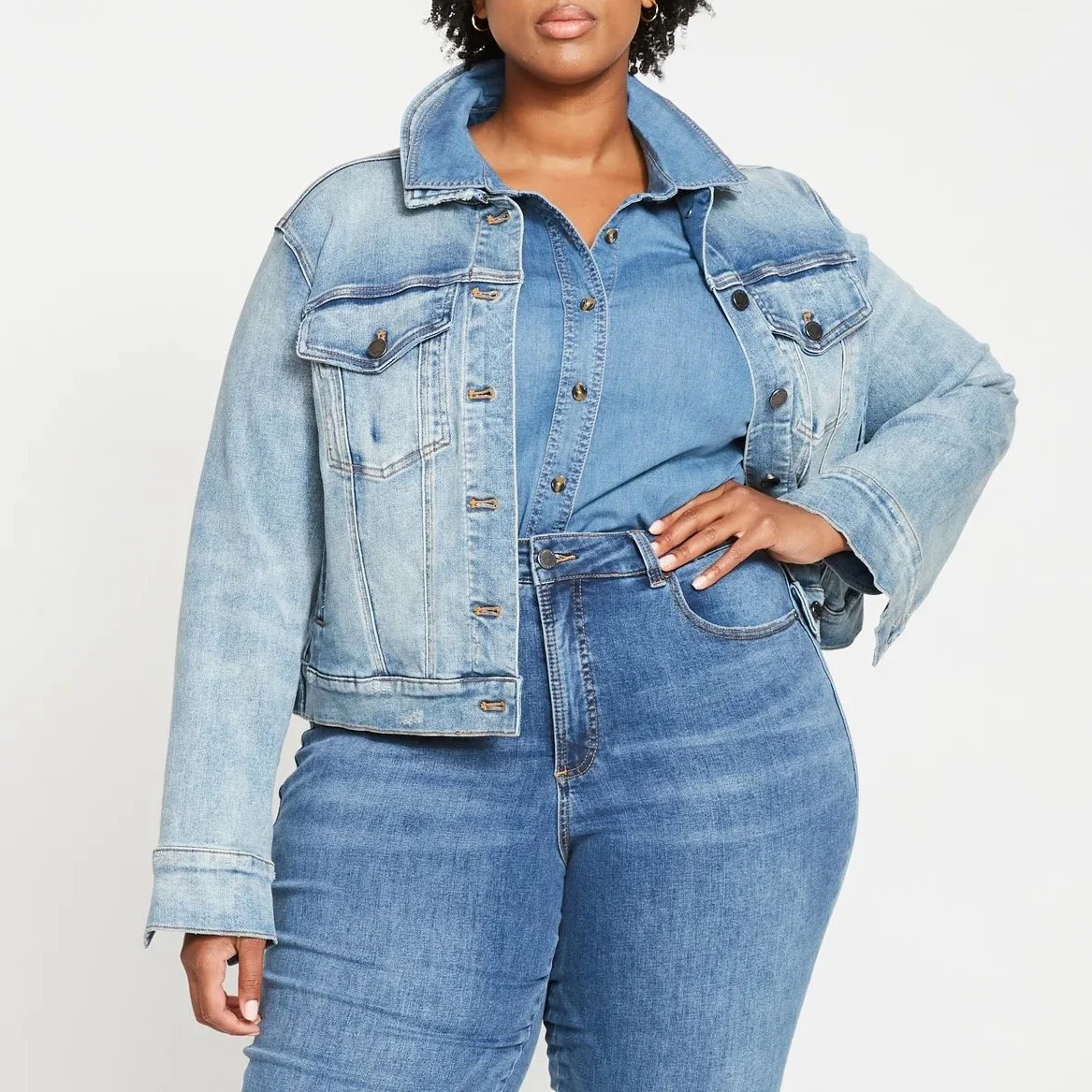 No, their real secret is that the right shape denim jacket is wildly flattering on a curvy girl. But they have to have two things: Clean lines and not too much length. This combo sort of nips the waist and makes our legs look inches longer.
