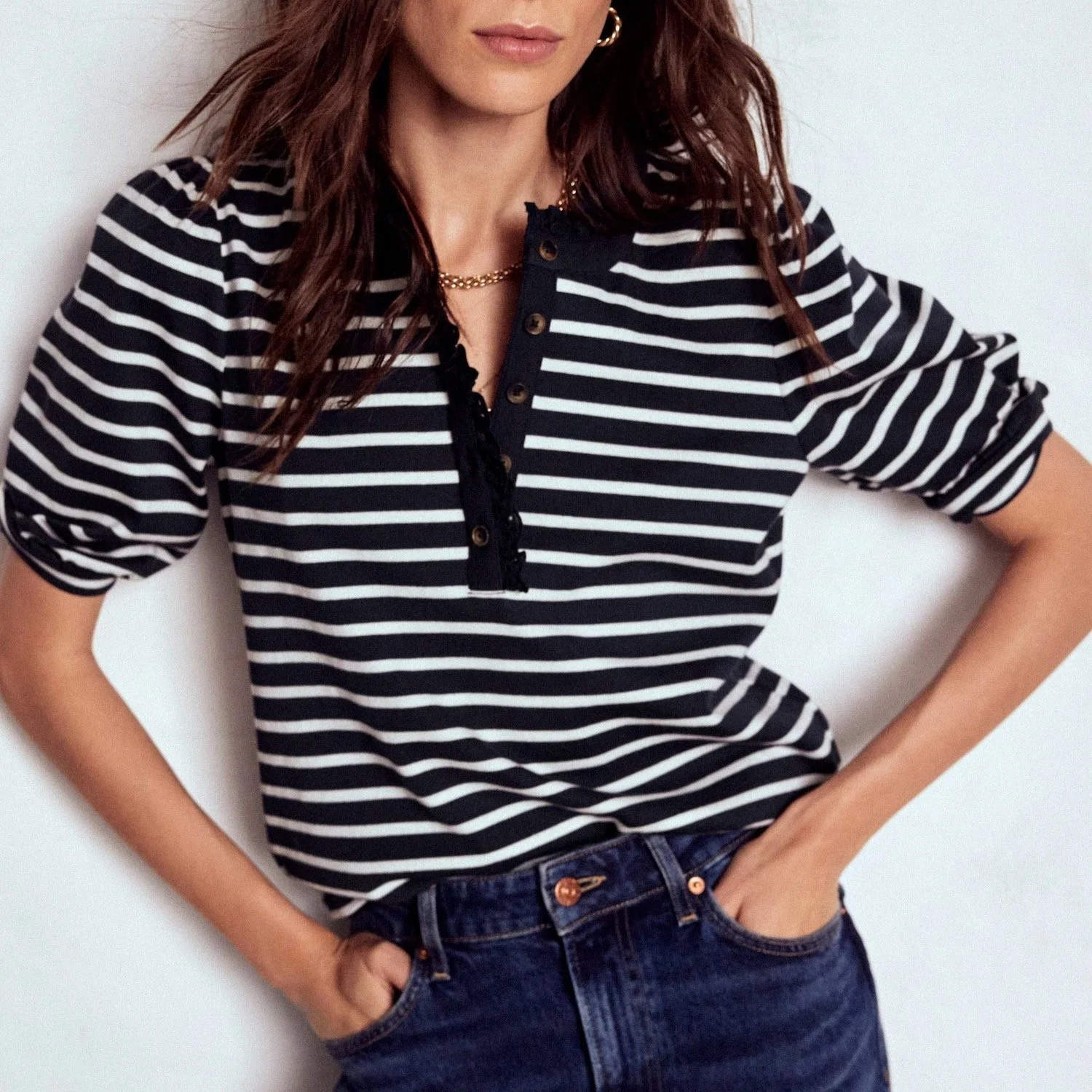 Why We Love It: This top is one of those pieces you throw on, and oops, you’re styled. Henleys are tees with a touch of class, and this one is one of the prettiest we’ve come upon. With wide leg jeans with lots of stretch or a roomy, long trouser, we look very smart but may as well be in a jersey tee and joggers we’re so comfortable.