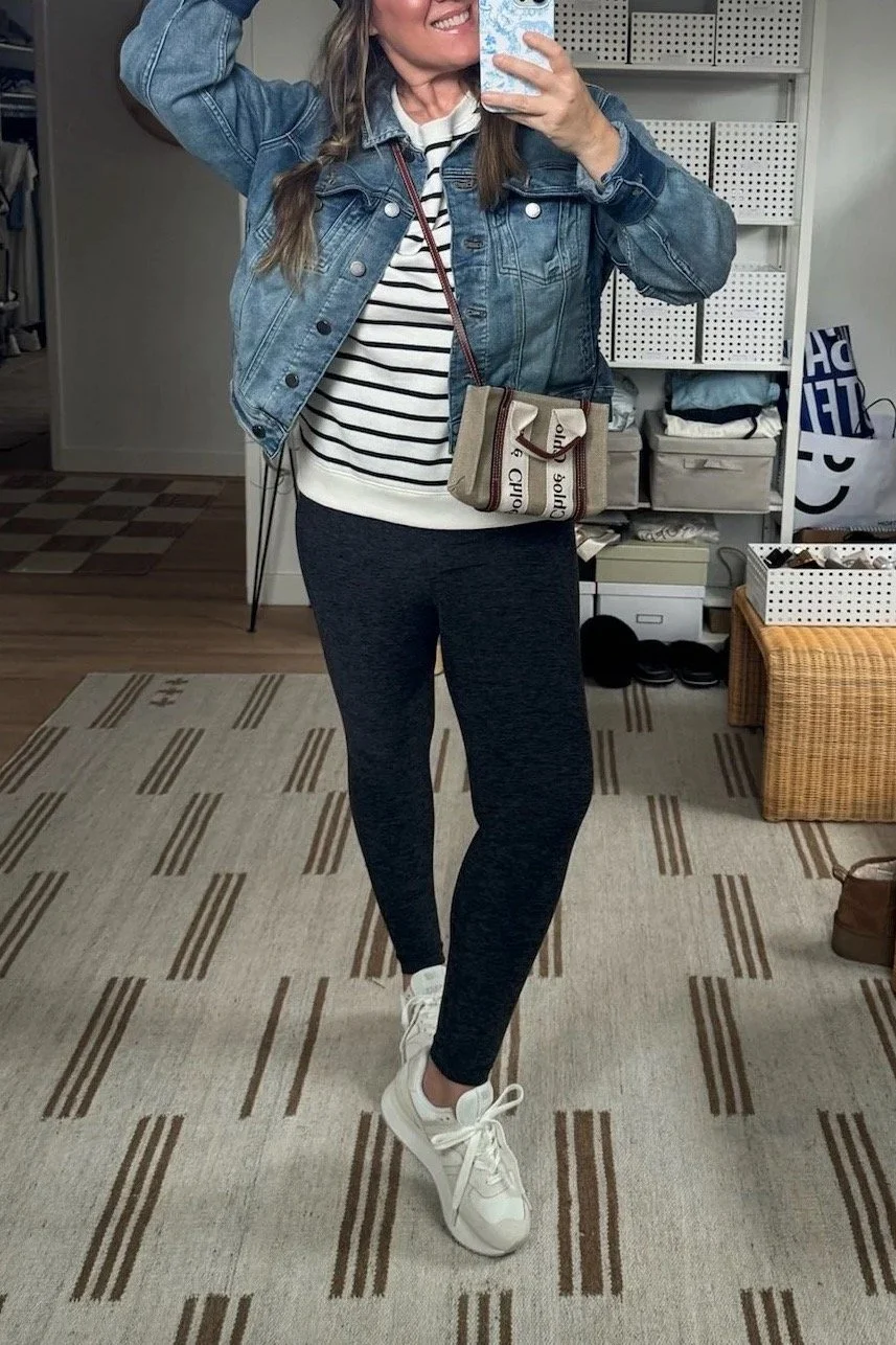 Why We Love It: These are the famous Beyond Yoga leggings we mentioned above. We’ve written emotional tributes to them they’re so smoothing and breathable and buttery. Leggings are just a smart way to stay comfy and flexible while balancing out the bigger tees and sweaters and sweatshirts we crave on bloated days. And they can be styled for more than a workout when we leave the house. Here’s just one example: