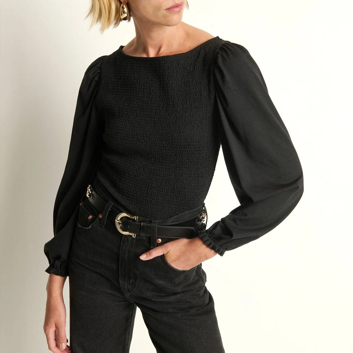 Smocking is like shapewear to those of us with thicker-waists. We know the model is itty bitty, but trust us when we say this sculpts all our curves, and the sleeves keep everything fancy and fun. We pair it with THIS belt, THESE statement boots, and jeans, and it’s a foolproof going-out uniform.