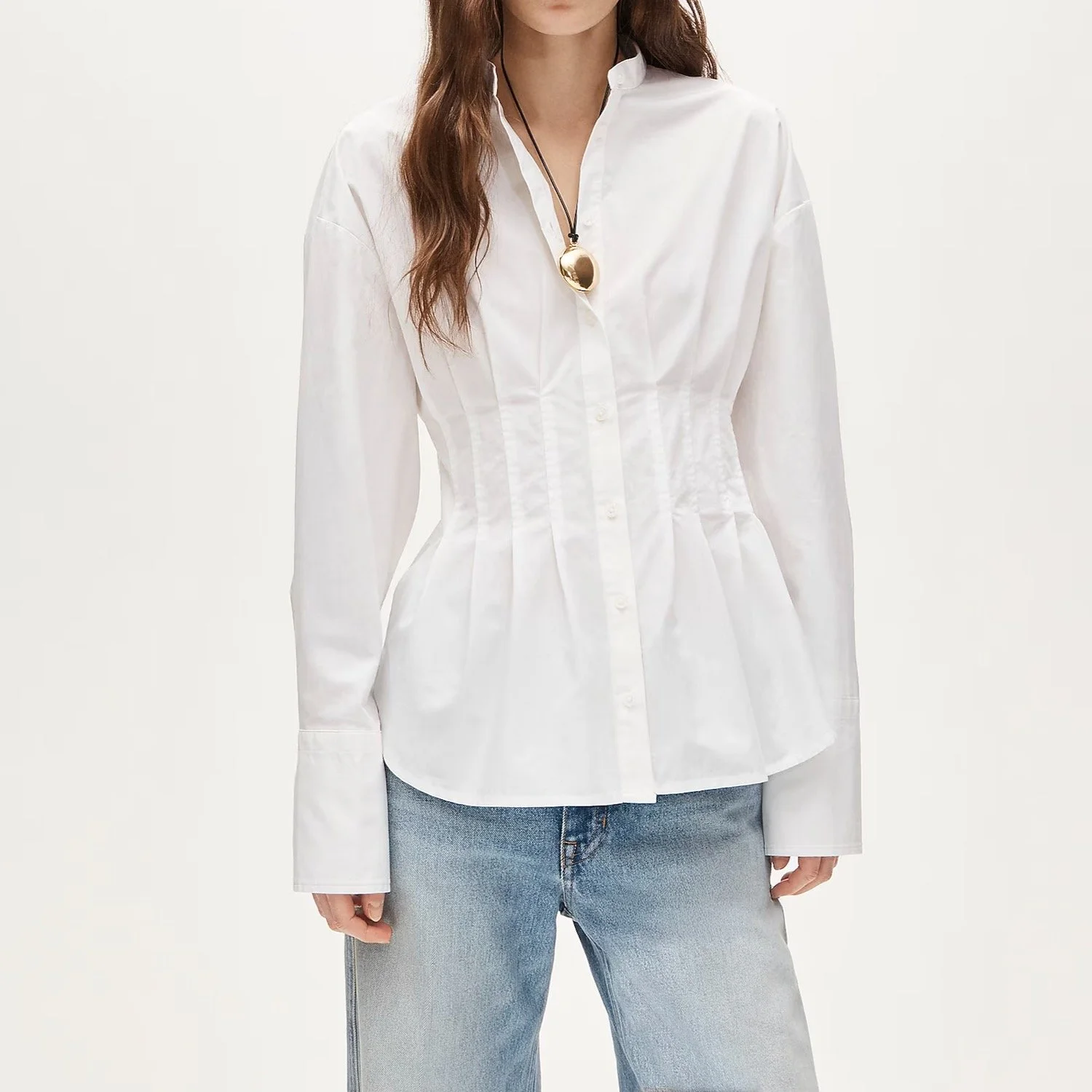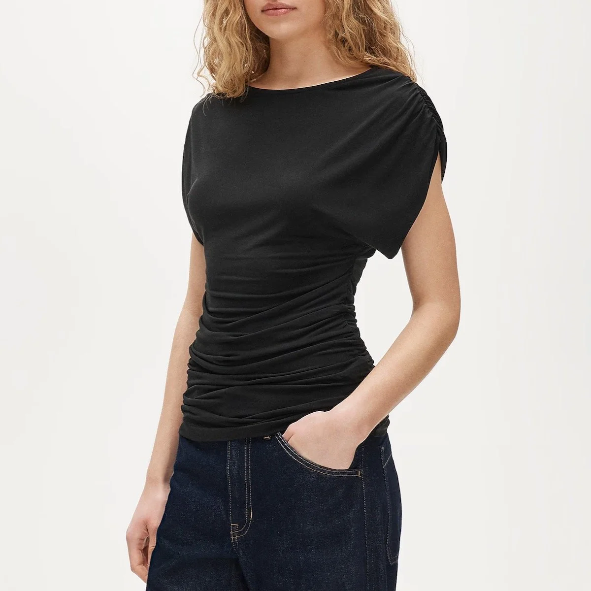 Ruching around the waist is the singular thing that makes us feel good in tops that are more fitted. This one nips the waist, covers any lumps and bumps, and looks intentional and designed instead of frumpy like so many baggy things we wear. We especially love this fit with skirts.