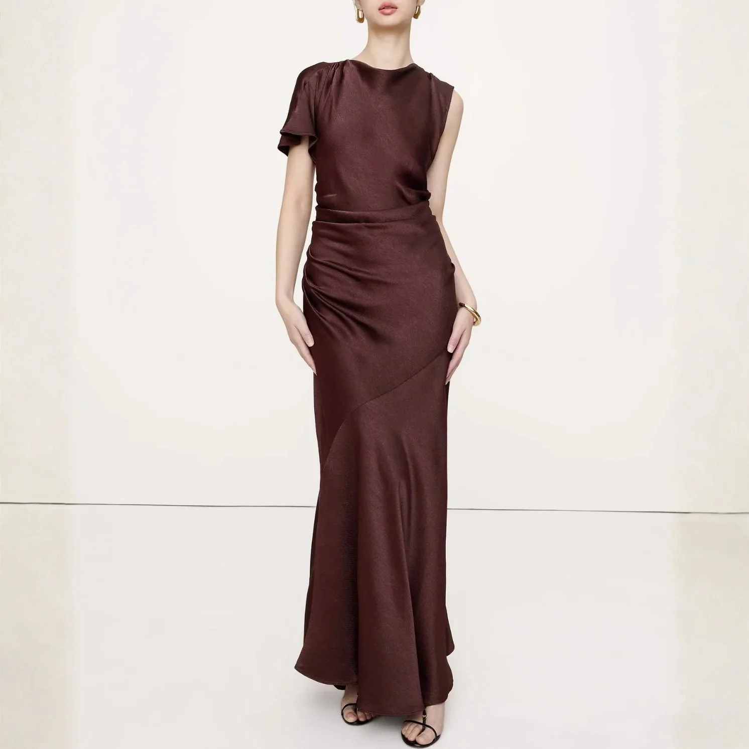 WHAT: Asymmetrical Hammered Satin Draped Maxi Dress*