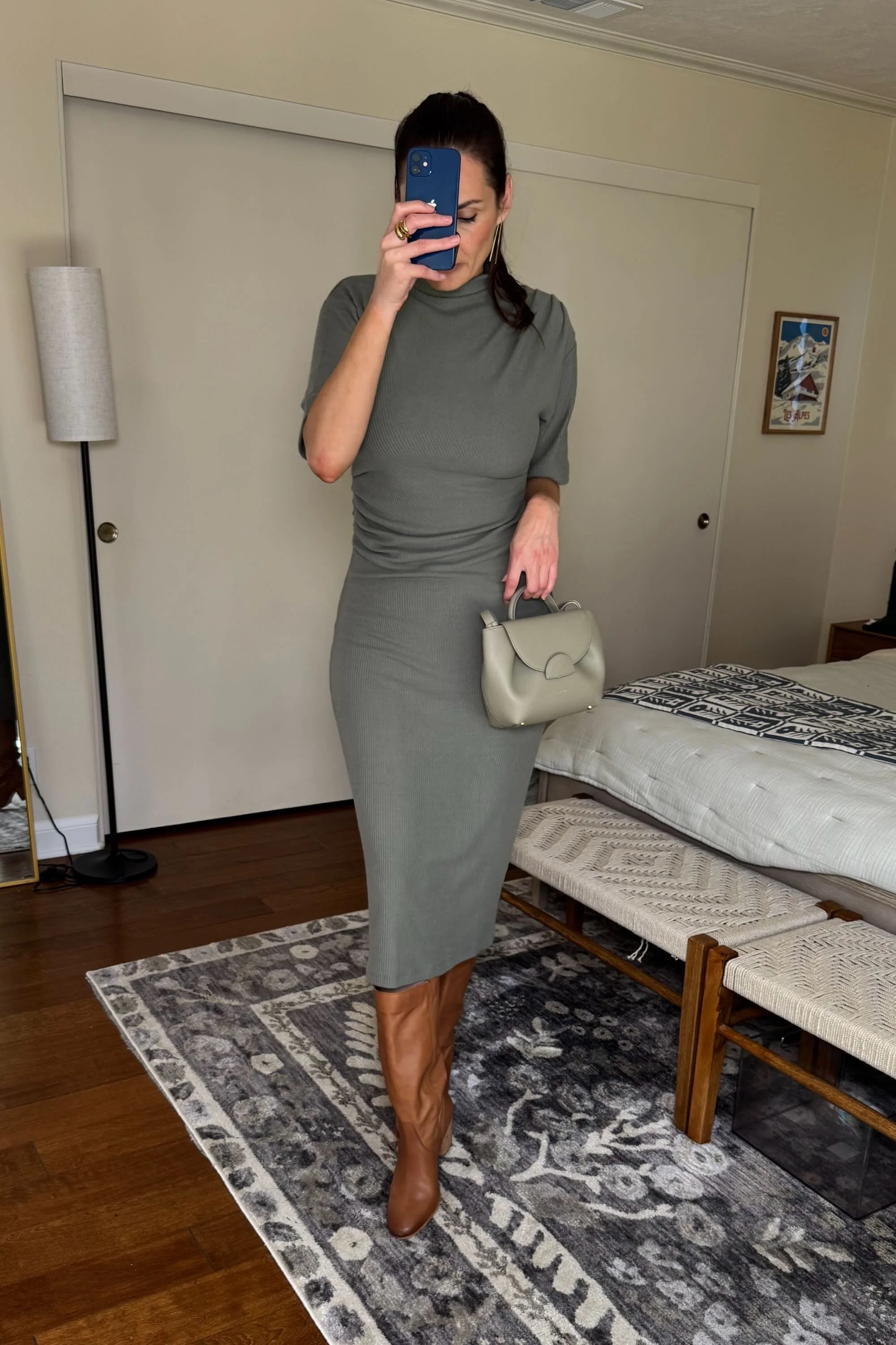 There are many ways to do it. The dress is a pretty neutral green (though it also comes in black*), so you can dress it up with a very comfy, low stiletto like THIS* or wear it with a tall, slouchy winter boot like THIS*.
