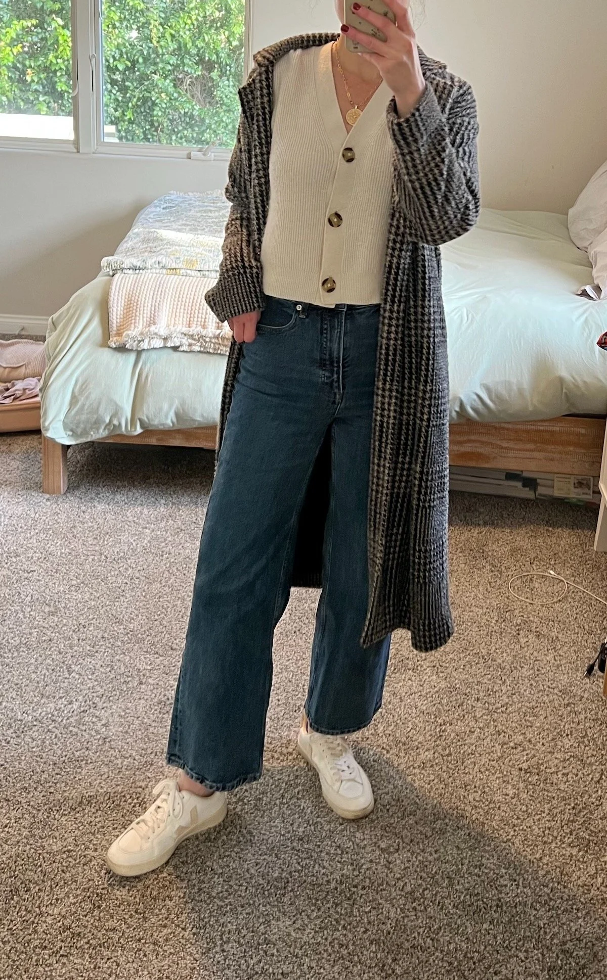 The Knit Coat: The LENGTH of THIS coat makes you look “smart” as the Brits say, but it’s also a total hack cuz it’s made of sweatshirt material so you essentially feel like you’re walking around in your coziest blanket. It’s soft as all heavens and has a weighted feel while being very sleek and slim, so it makes everything we wear under it look more polished. And we can wear it year-round. The plaid is great for making everything come to life, but it comes in the most perfect neutral solids as well.