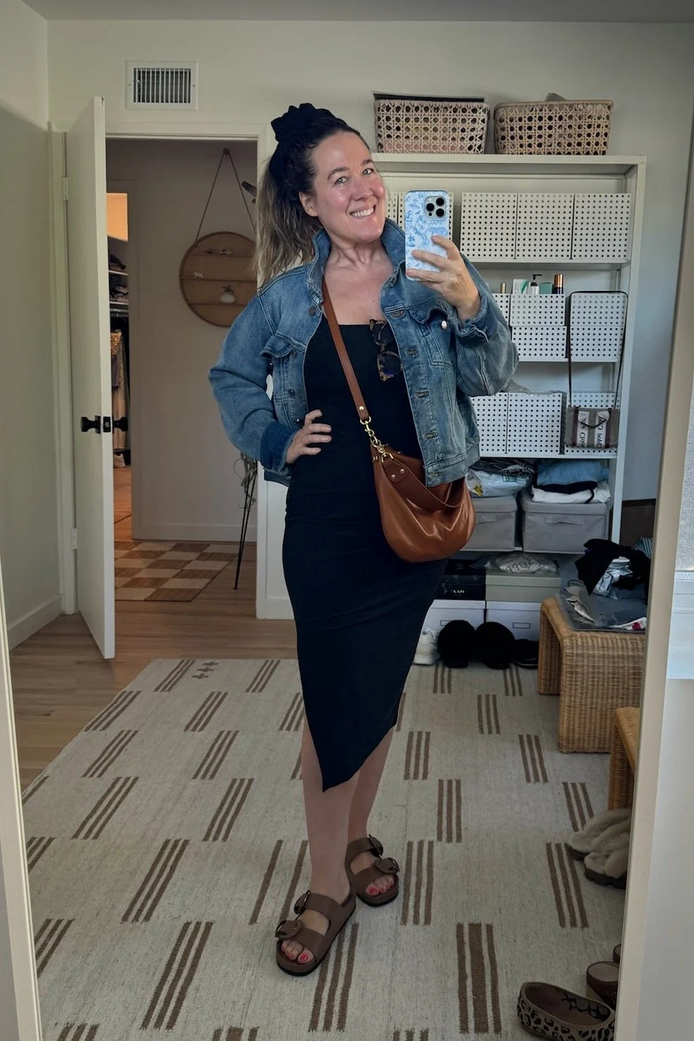 The Jean Jacket: An excellent-fitting jean jacket is a gal’s best friend. Throw it on over anything, and poof, you’re cool. It’s light enough to toss on over something sleeveless and roomy enough to layer over sweaters. And when it’s just a bit boxy and sliiiiightly cropped like THIS one (our favorite!), it makes our entire body underneath look narrower. And we feel comfortably covered, even in our tightest things.