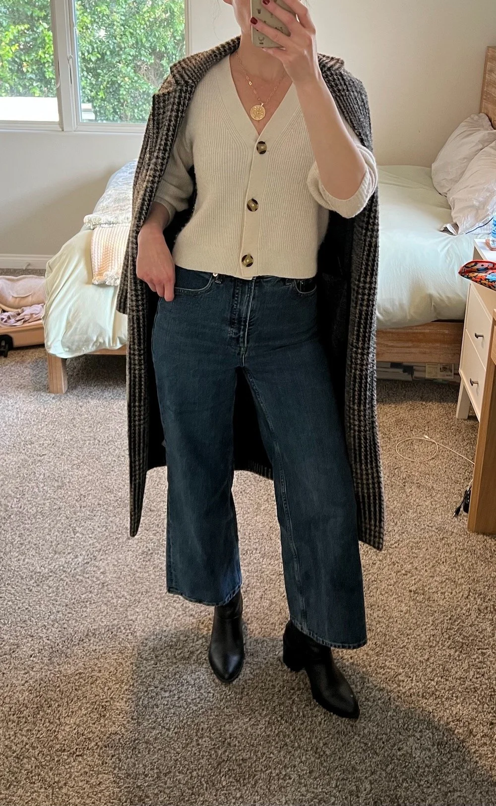If you’re saying to yourself this is just a sweater and jeans, you are quite correct. Realistically, most days, we just want to be wearing our coziest sweater and most flattering jeans. But there’s a wee bit of a hack to this look that elevates it slightly and makes it more flattering, all while feeling remarkably good on our bodies.