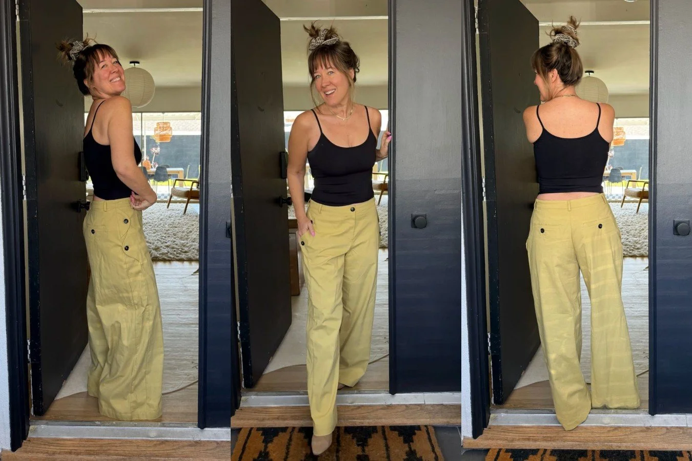 A surprise to no one, these are Maeve by Anthro, and the fit is un. real. These are a size medium, I’m wearing a mid-height boot, and I’m 5’6”. I actually bought them a few months ago and raced to my office to write about them but they had instantly sold out. I saw they were back in stock a few weeks ago but again by the time I went to write an article, they were gone again. There’s a few sizes left at time of writing this so if you see yours in stock, it may be a sign. These are sort of classic “work pants” but with this pretty button detail—I love wearing them with anything black, but the weird, in-between olive and khaki color honestly pairs beautifully with most colors. I also love them with a navy stripe, which reeeeeally helps my Connecticut roots shine. Here’s the side view and the back: