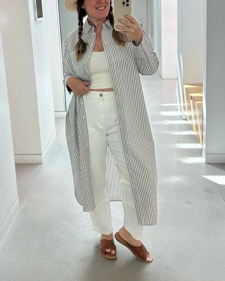 We don’t enjoy feeling self-conscious about our lumps and bumps when we wear fitted clothes or light colors. We try not to, but it’s also nice to own a light, layering piece we can just throw on to give us the boost we need to wear clothes we love but that we’d like more coverage in. These two layering pieces give us that coverage without overshadowing the whole look.