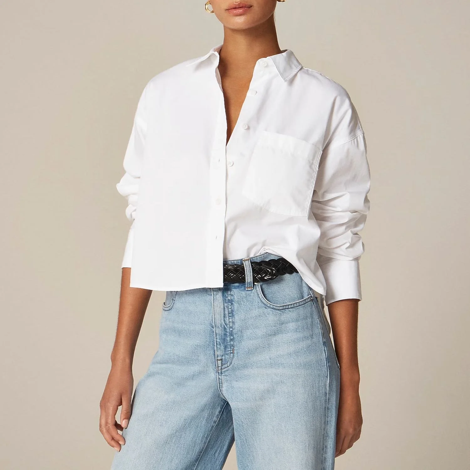 Why we love it: When we put on a crisp, white, poplin button-down, roll up the sleeves, unbutton a few buttons, it’s like a supersuit for chicness. This one gives you loads of coverage but the crop makes it wildly flattering and easy to style.