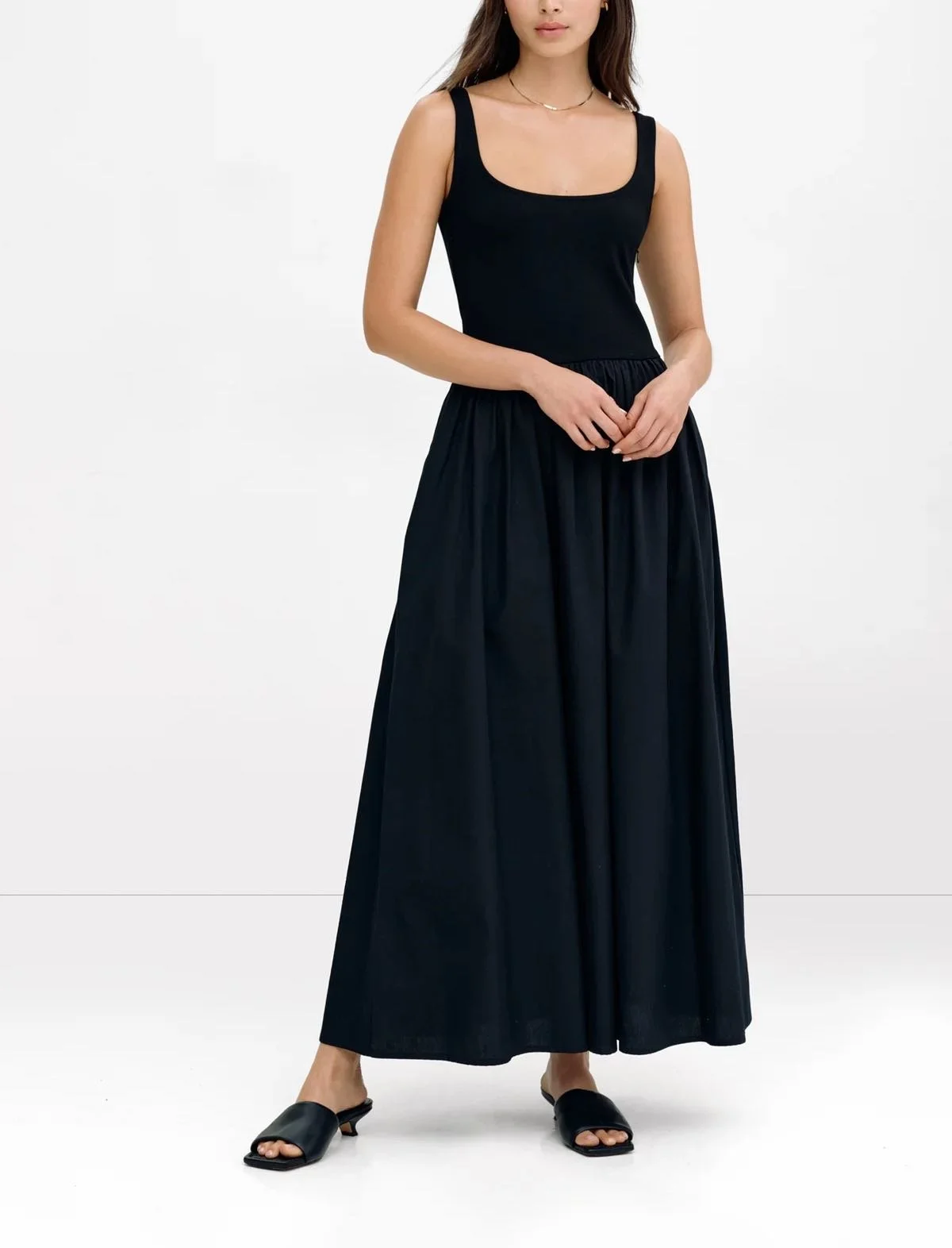 Why we love it: We tried on this dress and loved it so much, we asked Marcella to partner with us, so we could write a dedicated article all about it with lots of photos. The top is all stretchy tank and the bottom is all spacious poplin. We wear it with boots in winter and sandals in summer - both belted and unbelted, and it’s foolproof every single time.