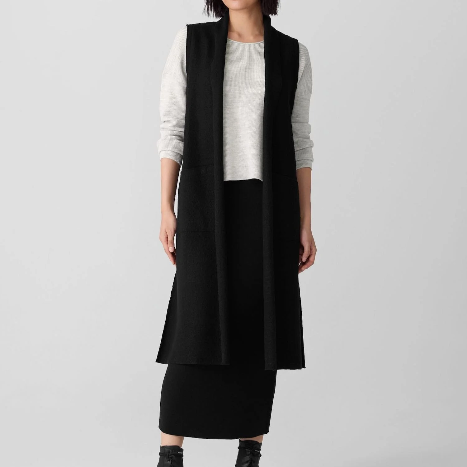 WHAT: Eileen Fisher Lightweight Boiled Wool Shawl Collar Vest in Regenerative Wool*