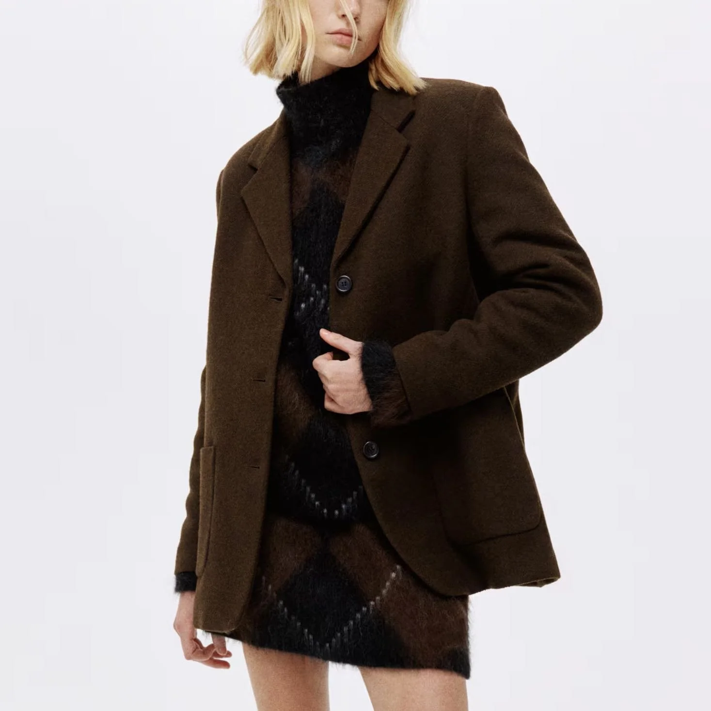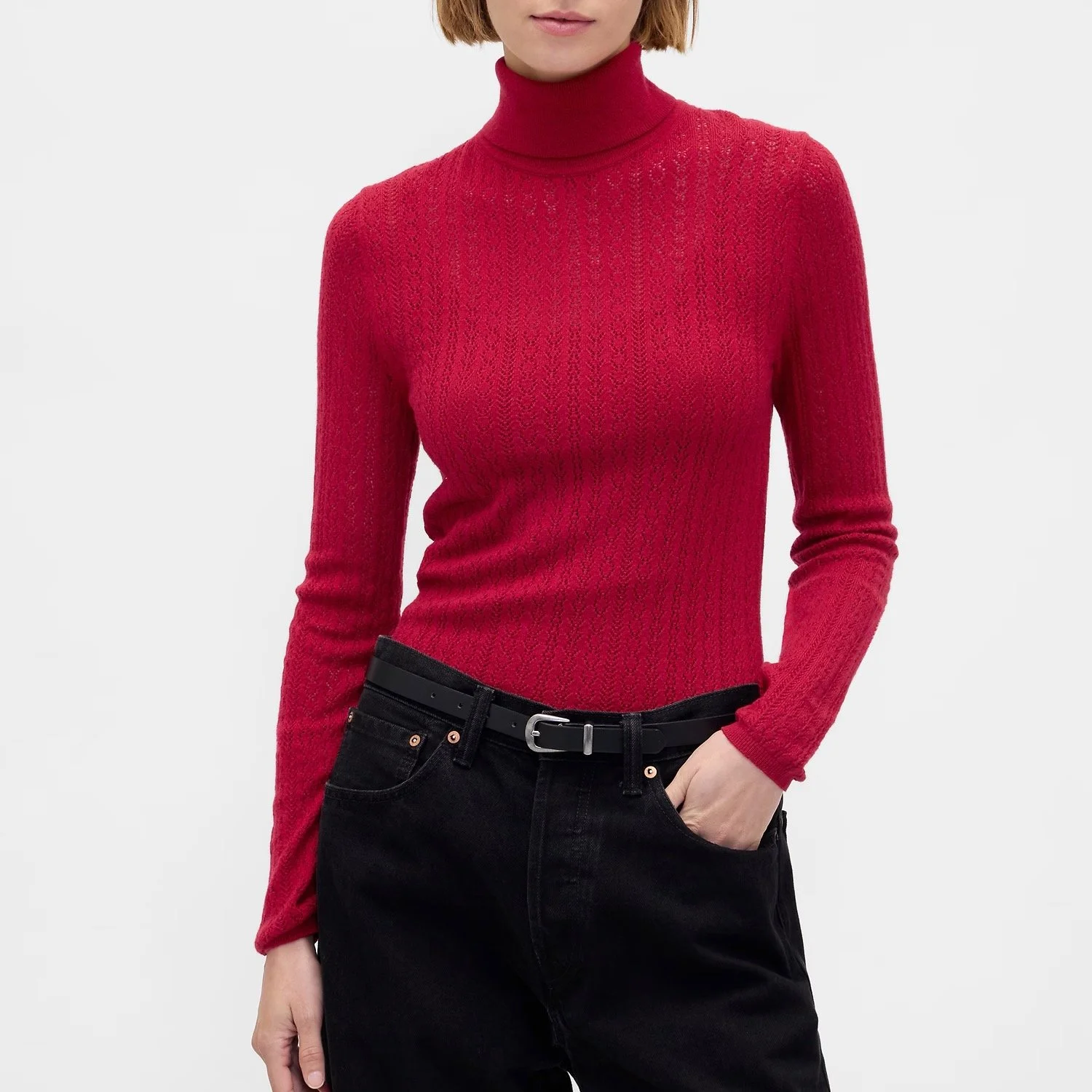 The colors of this look, from the red turtle to the rich chocolate coat to the dark blue jeans, are part of what makes it so firmly locked into our in psyches. We love that this one is pointelle and doesn’t add bulk to out frame and, most importantly, is deeply, deeply cozy.