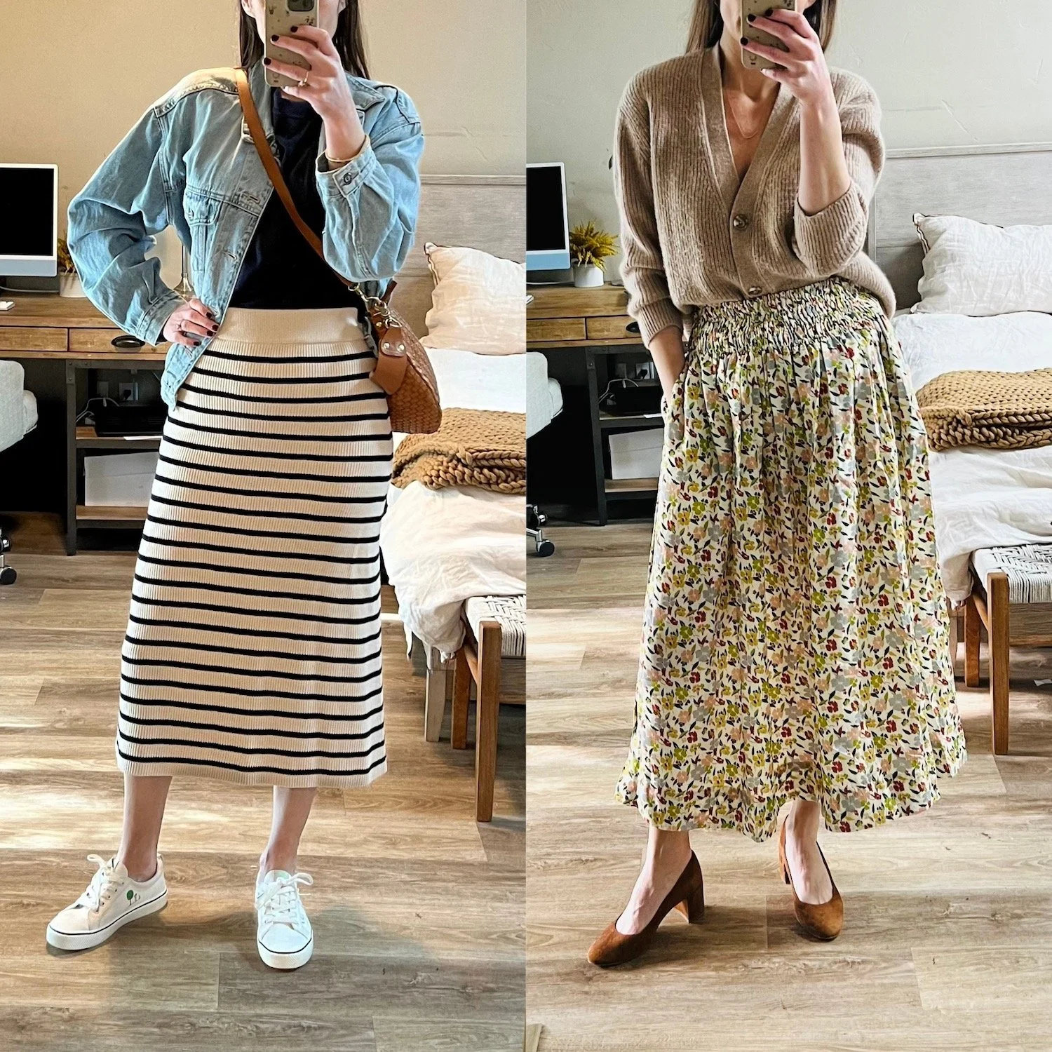 Why: Most of us have our go-to black or neutral colored skirts, but pairing patterned skirts with other basics can actually be very chic and outfitty without any work. The trick is to choose skirts with some give in the waist, so it’s not molding you into unflattering bulges left and right. This is best done with a thick smocked or elastic waist, that narrows our middles and makes us feel completely comfortable
