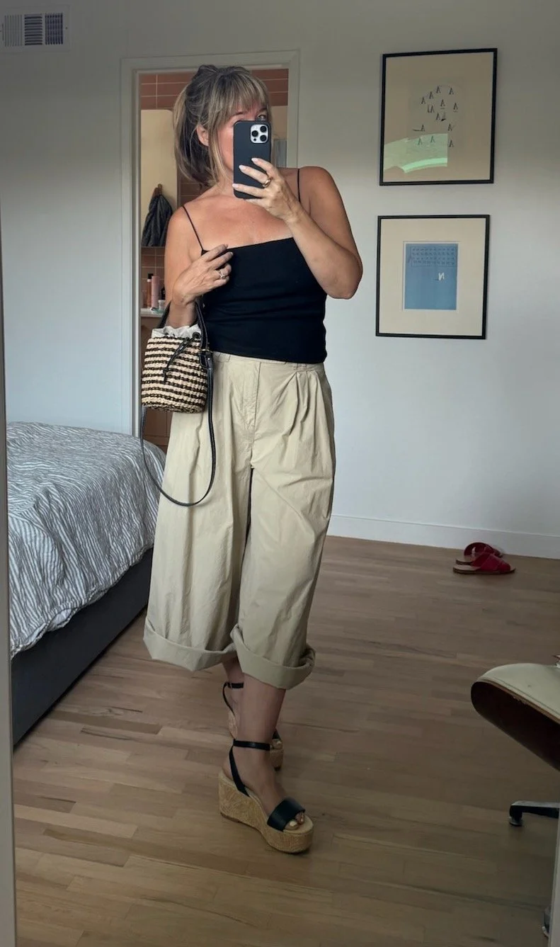 And here’s another example of our own recent spin on this where we used a tank and just rolled up a wide-leg trouser we already owned:
