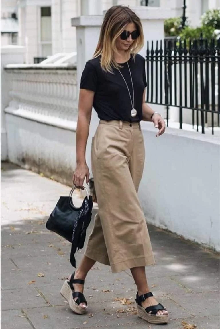 It’s simplicity itself but by combining these exact elements: whispery tee, wide-leg cropped pant, comfy platform, we look understated and quite “quiet luxury.”