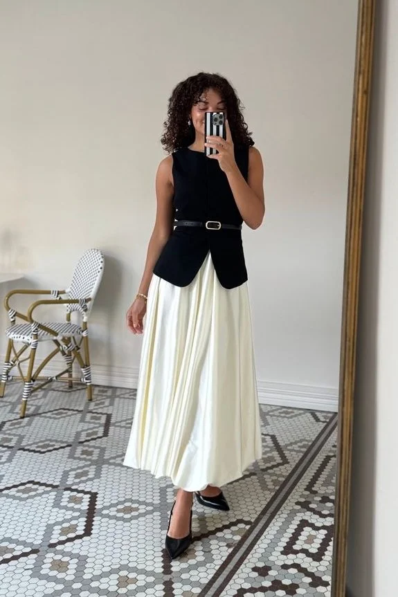 Once again, we must mention proportions. The vest keeps everything smoothed and structured and the skirt flows beautifully.