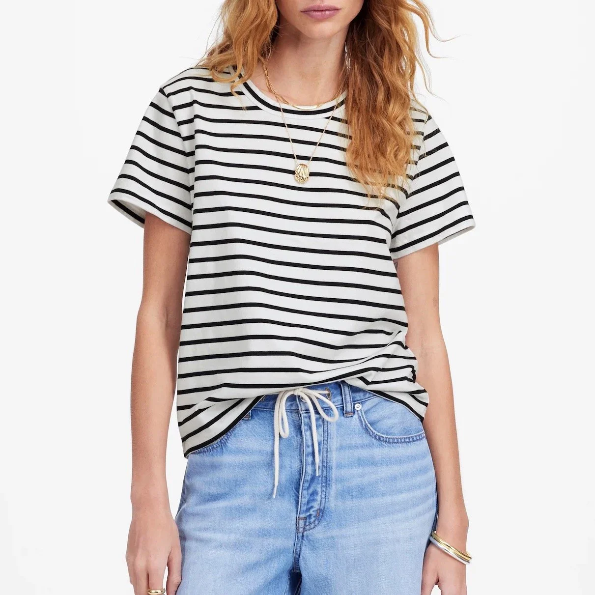 Proportions! Tuck the tee into a high-waisted, slightly flared pant, and the hourglass will be commanding.