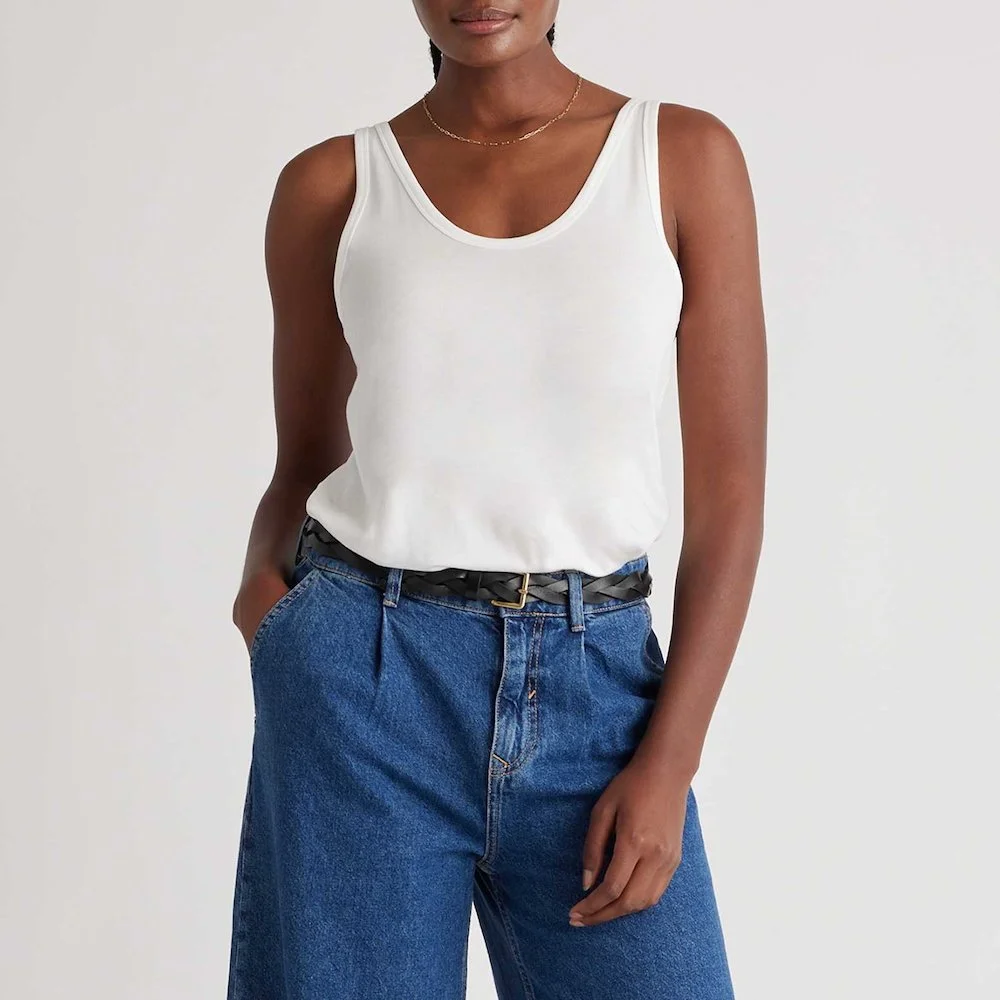 It’s very easy to get it wrong with a t-shirt and just look like a frumpy rectangle. This one is just cut … better. For starters, it’s so soft so no stiffness. The length is long enough to tuck but to not look sloppy untucked. And there’s almost a slight swoop-like shape to it that makes our waists look smaller. In an endless pile of plain black or white tees, this is the one we reach for.