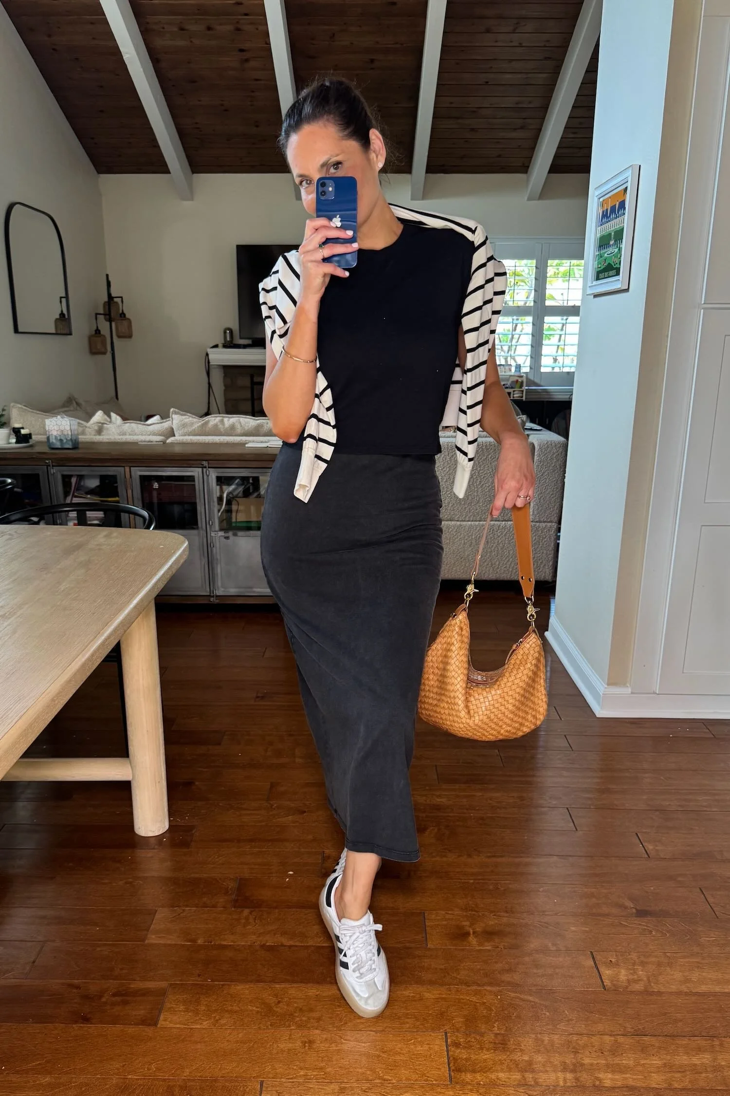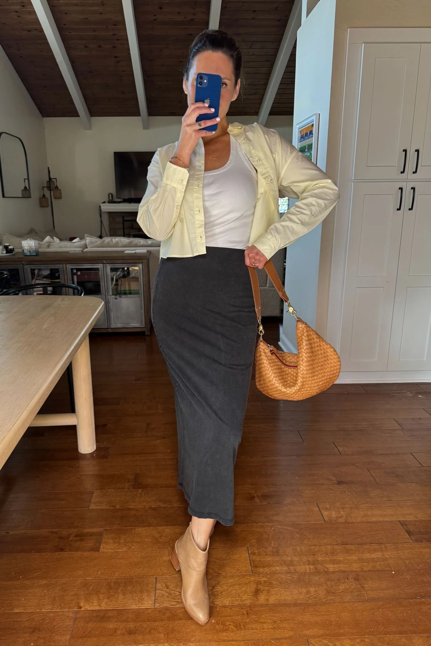 How we’re wearing it: With every neutral outfit but especially that stretchy black skirt* we keep talking about. Depending on the weather (or how much bread we had at lunch), we wear it like this throughout the day.