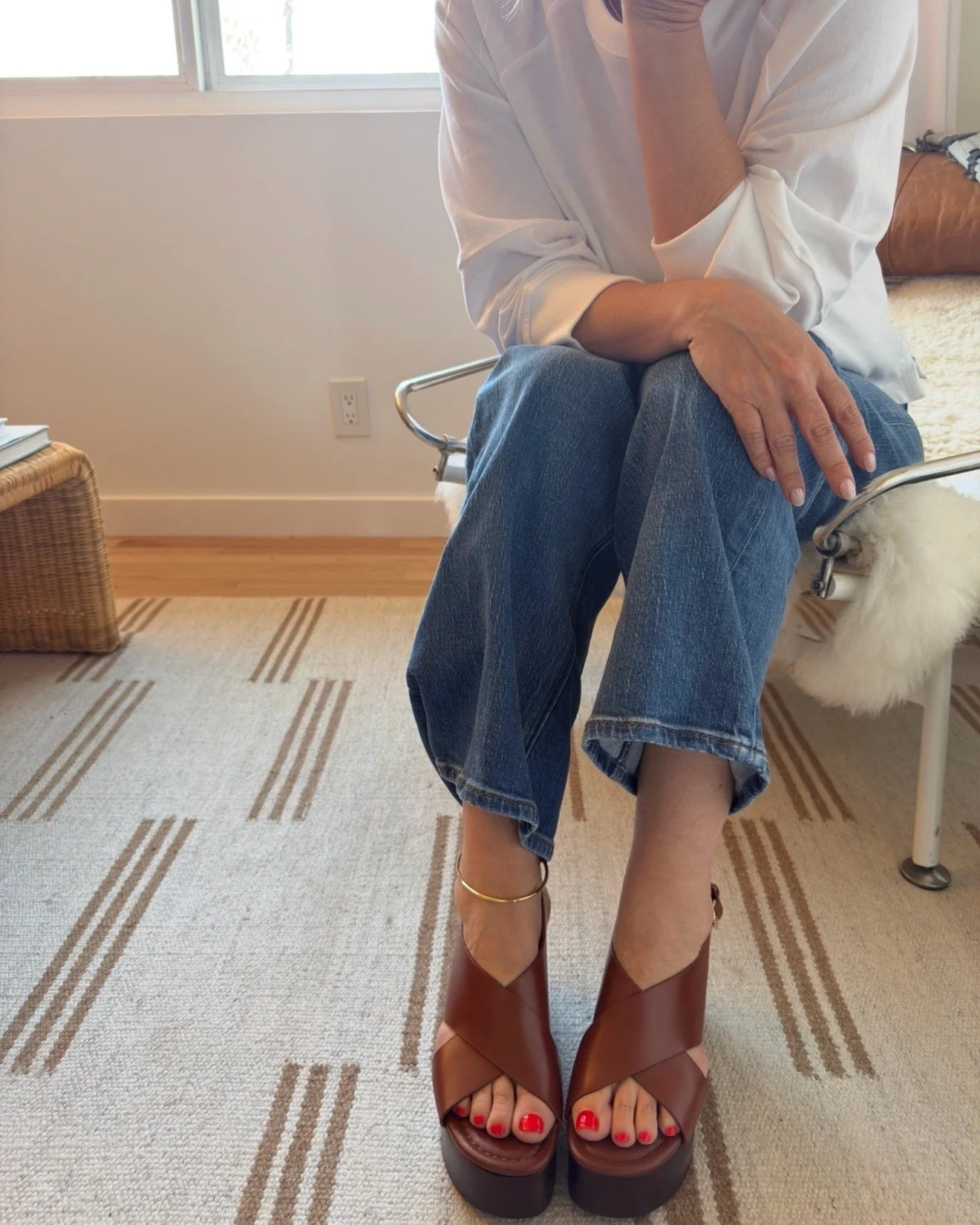 Yes, you just saw these shoes in action in the previous photo. It is difficult to explain how preternaturally comfortable these shoes are. They give some height but with ZERO pain, and the sole is so cushioned and bendy they truly feel like some kind of orthopedic cloud. In my old age, I simply do not slip on shoes that are in any way uncomfortable. But I still long to finish a cute outfit with a cute shoe. And I absolutely will pay top dollar for foot comfort. It’s a great place to invest in your wardrobe. And, why yes. That is a hard bangle anklet.* I’m trying to make it a thing.