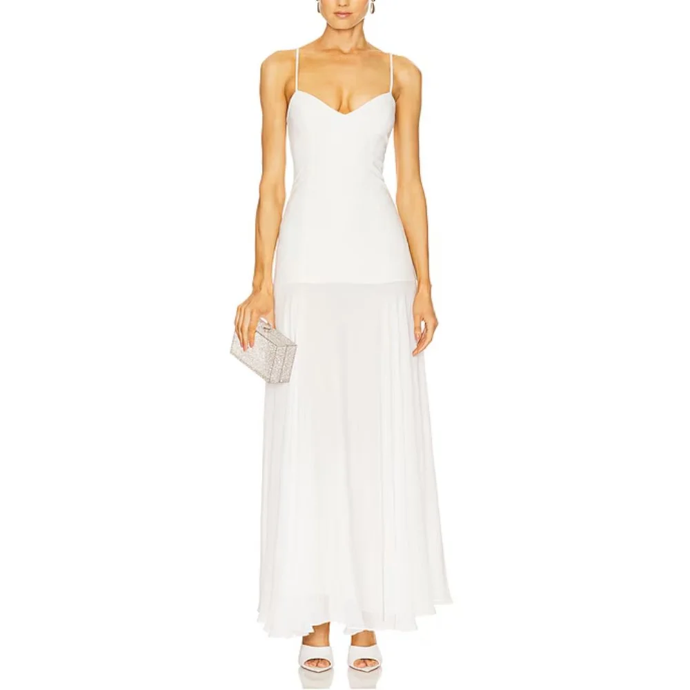 Sometimes the prettiest, most impactful thing we can wear to a party is a white dress. And the way to wear a white dress while feeling completely unself-conscious is to make it a fit-and-flare, maxi dress that sculpts your upper body and flows over your hips/ thighs/ butt. This is our fave conception of that dress. It will look gorgeous on you. That’s just how it’s made.