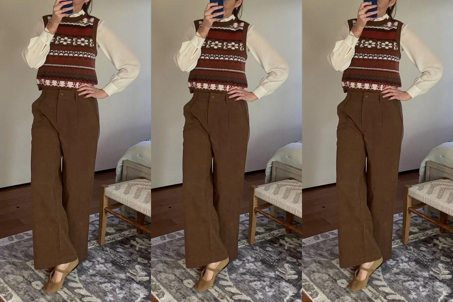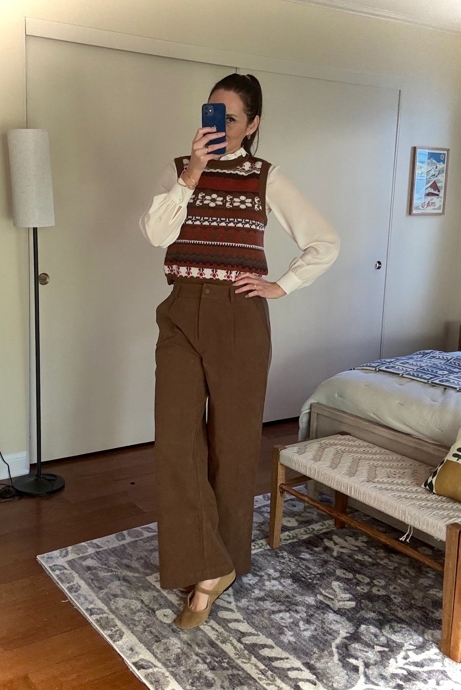 Why we love it: Pair these classic pants (which are actually corduroy) with the sweater vest below and THIS* crisp button down and a blazer and poof, you’re Meg Ryan in that scene where she’s describing her dream where a faceless man rips off all her clothes. Aka the outfit we’ve thought about every day since 1989.