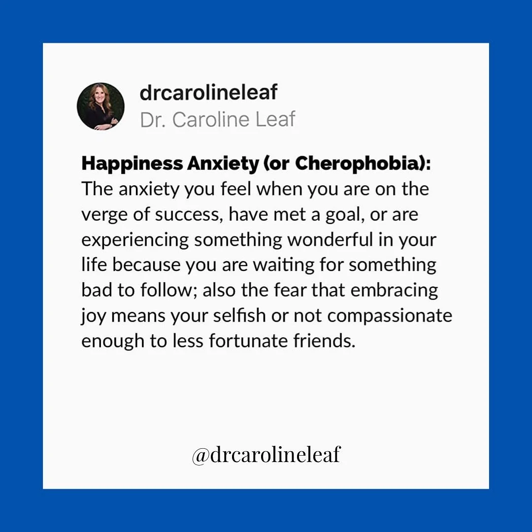 Cheraphobia describes a fear of being happy, a consistent worry that something bad will follow something good or that there’s something wrong with you for allowing yourself to experience joy.