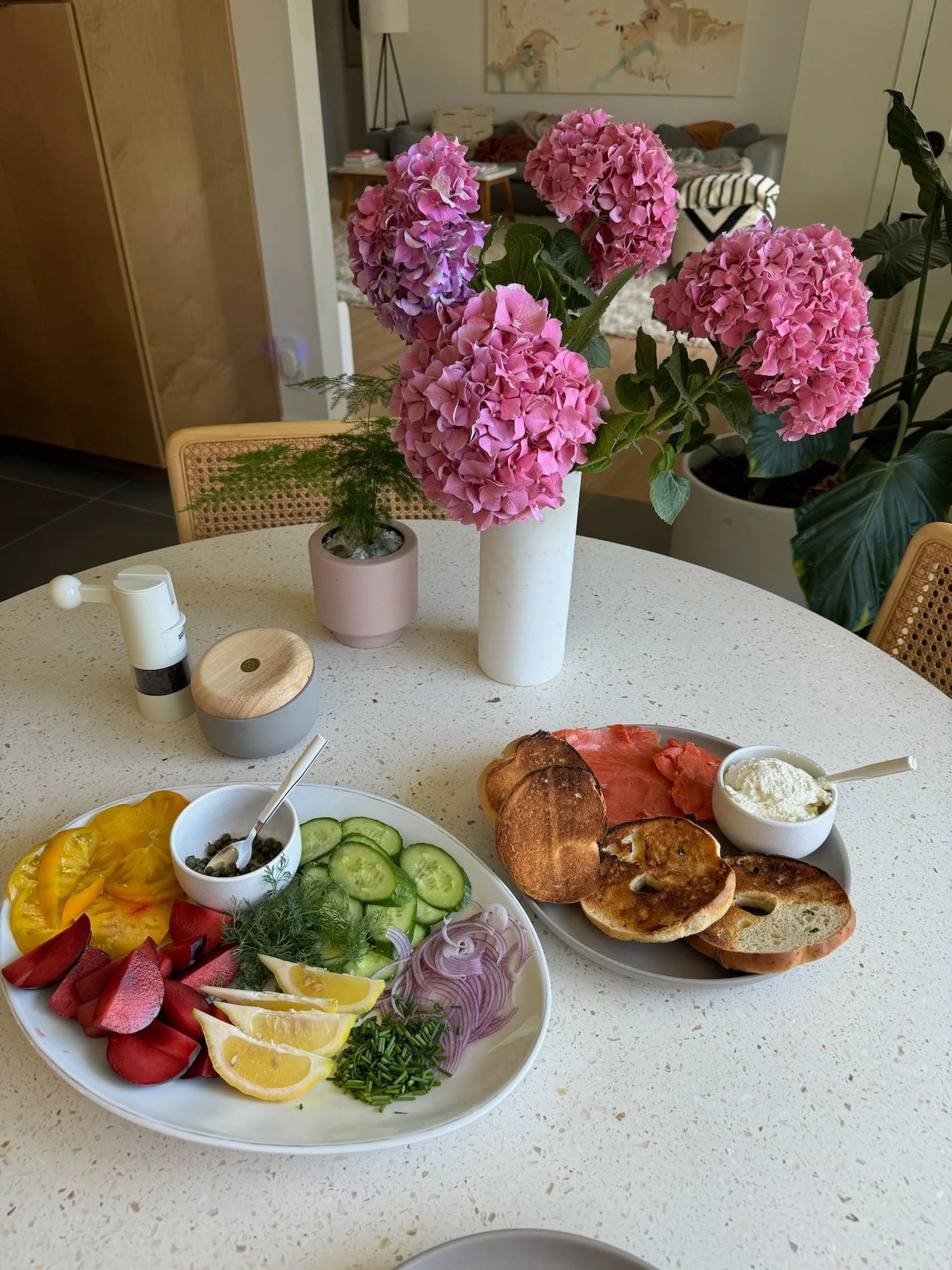 The protein to calorie ratio for lox is like a fever dream. And almost nothing keeps us fuller. It’s a lovely way to create a brunch spread on the weekend that doesn’t undo all of your hard work that week. The key is using it in a way that doesn’t make you gag. And for us, a bagel spread is that way. We use THESE bagels that we order or get from Whole Foods, but be warned, they are so popular the brand can’t keep up so expect delays.