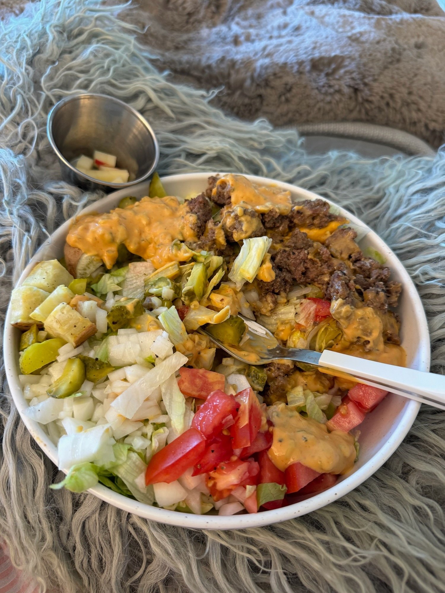 Here’s our current hyper-fixation meal using ground beef in the home which is a Big Mac bowl made with lettuce, onions, pickles, tomatoes, ultra thin sargento cheese, and a quick sauce of relish, ketchup, mustard, and yogurt. Beyond.