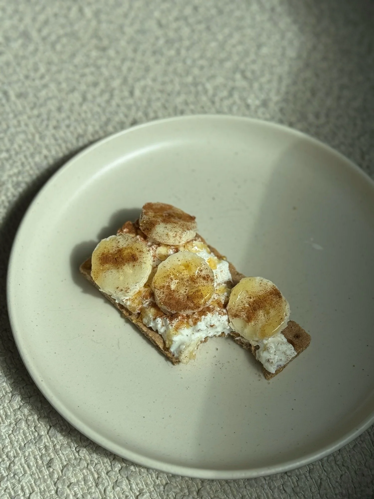 And if you’re interested in a perfect, wildly filling snack, it’s 3 Wasa crackers topped with CC, banana, cinnamon, and honey. Oh, here it is now.
