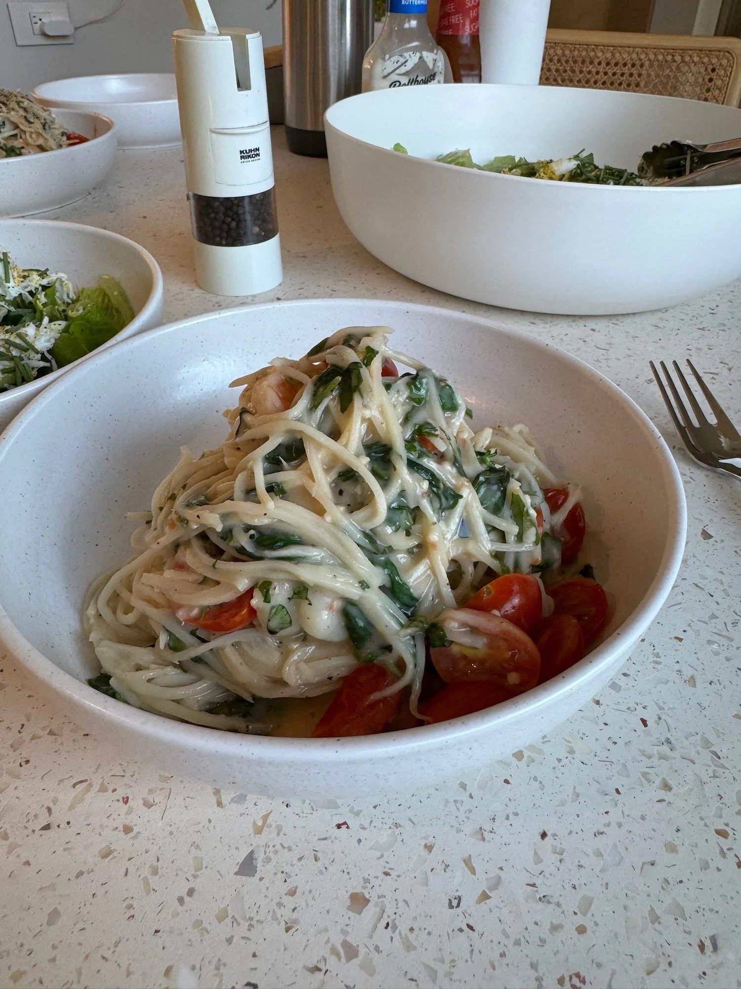 We also love it with the aforementioned blended cottage cheese used as Alfredo sauce, frozen shrimp from Trader Joe’s, spinach, garlic, and tomatoes. So easy and so filling.