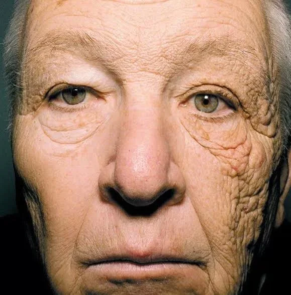 Photo of a truck driver who spent 28 years with the left side of his face facing the sun from the driver’s seat. (Source: Daily Mail)