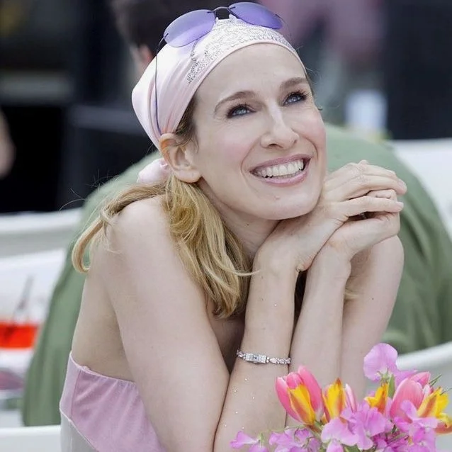 WHY IT WORKS: For starters, we’re not interested in washing our hair every day (nor should we be now that we’re 40, and it’s one of the things that makes our hair dryer and more brittle). But more importantly, a scarf tied on our head is one incredibly effective way to add zhuzh to an otherwise simple or minimalist outfit. It’s a tiny, artful expression of our truest taste, which is what wearing a scarf is all about, especially when it’s acting as the crown of our entire look. Play with pattern and print as much as you like - just make sure you get the right size if you want the full Bradshaw triangle. You can choose something more narrow or rectangular if you’re doing a more headband style. Either way, the below method is brilliant and ensures it won’t budge.