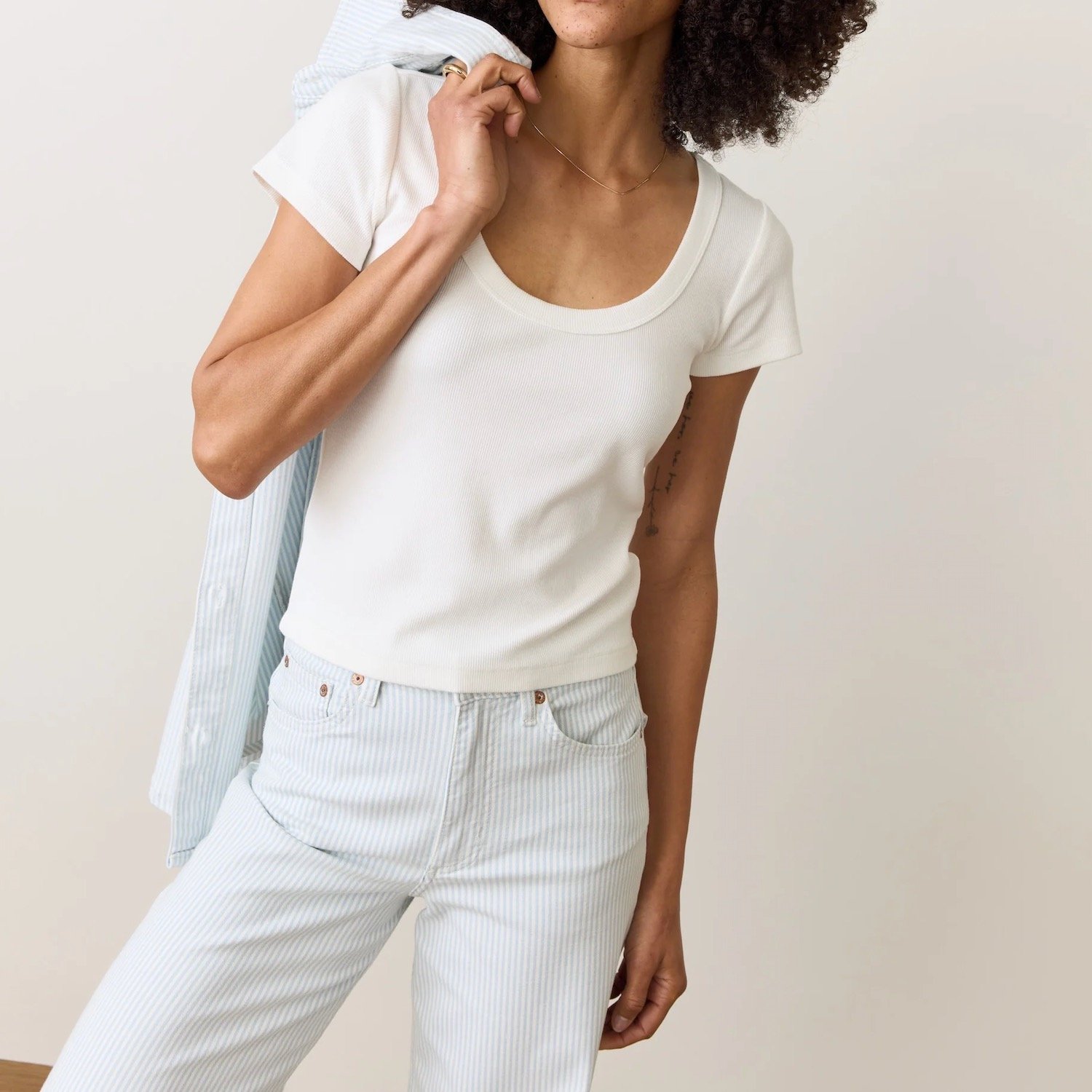 Why it works so well: White tees are not all created equal. We know this because most of them make us look like thick rectangles. The most flattering version has a scoop neck (slims shoulders and frames your chest) and ribbed fabric (smooths you out and holds you in). And so my friends, here she is: our fave tee for spring.