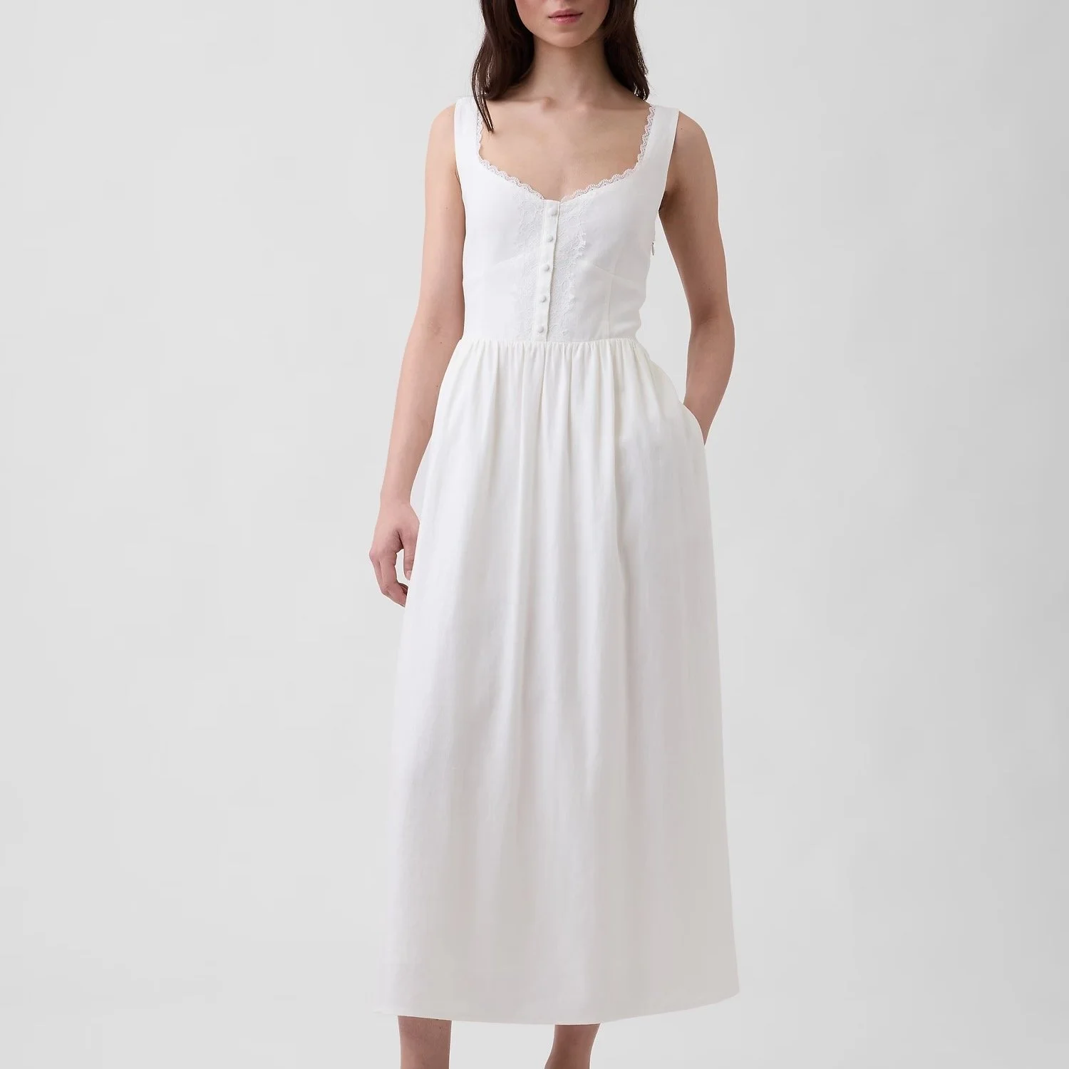 Architectural or corseted tops can be so flattering, and they look styled all by themselves so we don’t really have to think too much about the rest of the outfit. This one is sculpting and has a beautiful neckline that’s great for boobs and bellies. In other words, you don’t have to have Margot Robbie’s Barbie physique to get your best, hourglass silhouette. It comes in three colors, but white is great for spring/summer. We also wear THESE under it for smooth, nip coverage and lift.
