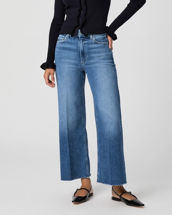 THE ANESSA*: If you feel strongly that a wide-leg jean will make you look bigger on the bottom, these jeans we write about constantly just glide over curves with the perfect amount of stretch and a slight A-line cut that balances hips/ butt/ thighs and gives you incredible shape …. and they do all this without leaving a waist gap.