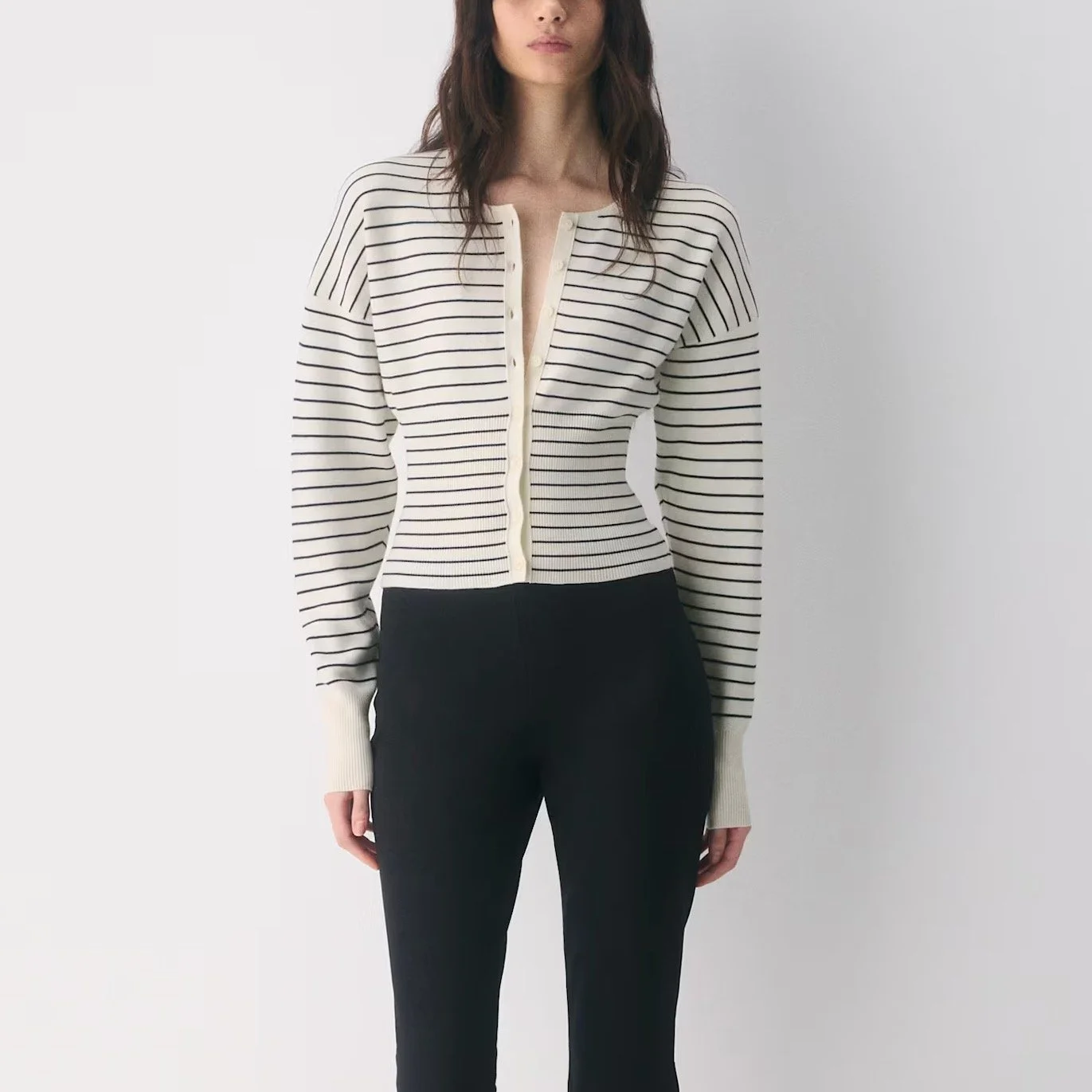 The drop shoulder and the cinched waist will make you look your most snatched, as the kids say. Also a dream if you have thicker arms, this cardi doubles as such a gorgeous top with any pants/ jeans/ skirt. We love the stripe, because nothing is more quiet luxury than a stripe, but it also comes in tons of solid colors.