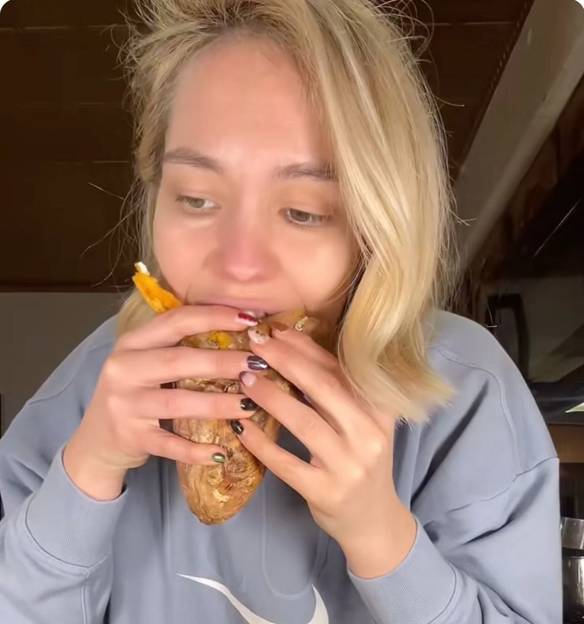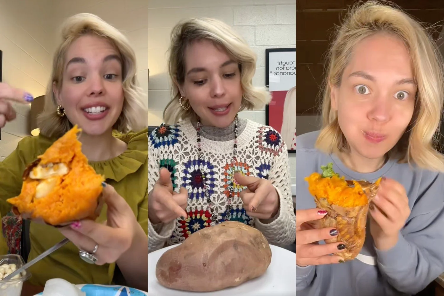 Big, baked, juicy as a steak, and oft treated like a baguette or a burrito, the sweet potato Courtney totes with her to work is usually eaten on camera after mayyyybe 30 seconds of stuffing it with a filling, the most famous of which we’ll get to in a moment.