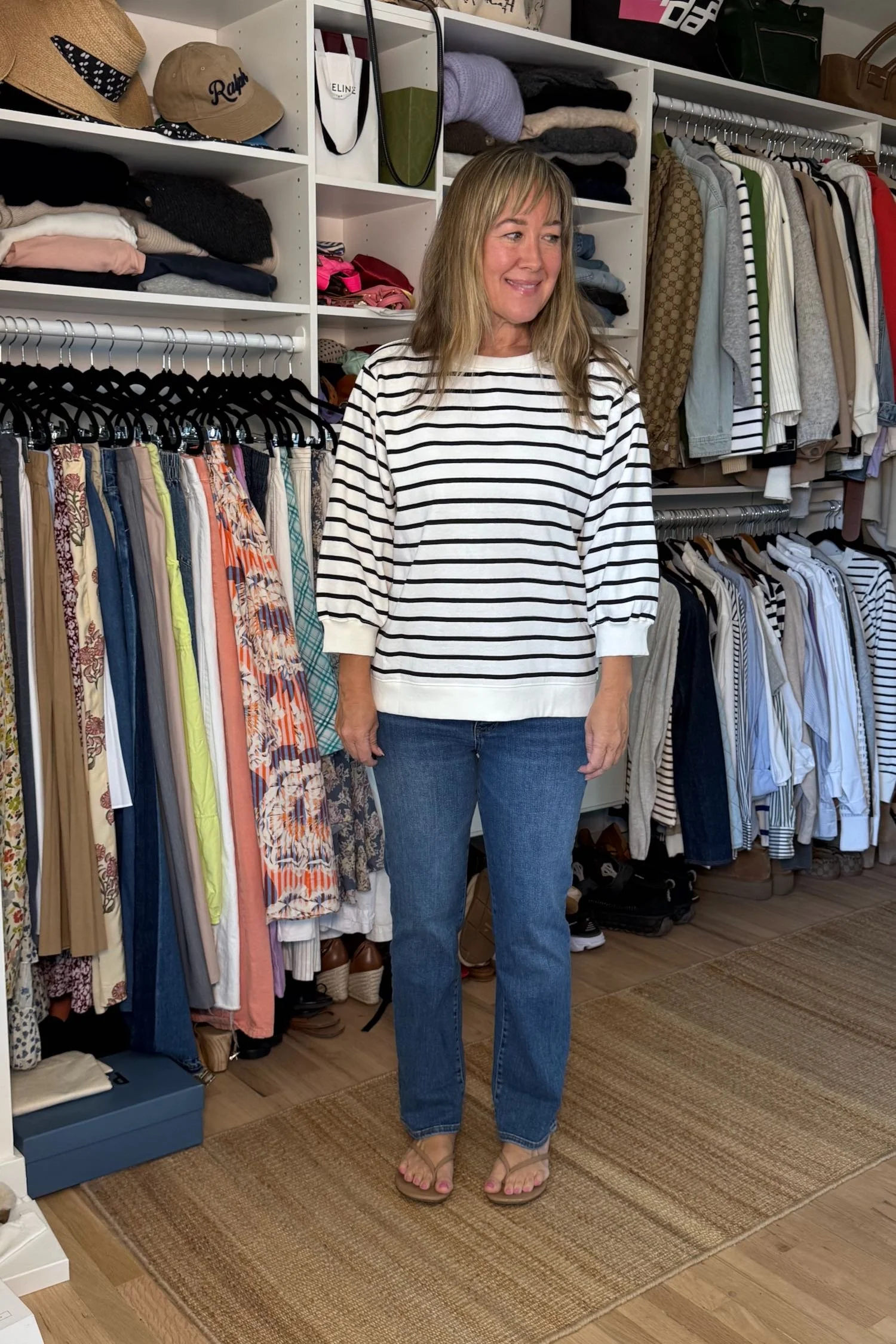 Why It Works: Those are the same jeans* but I cut them to expose my ankles. It’s a neat trick that weirdly makes the leg look so much longer. Go compare to the other photo. Scroll up. I’ll wait. Isn’t it miraculous?! The striped cropped blazer* is actually just sweatshirt material so it’s comf, but 987% more flattering. A wide belt like this* one can help mitigate the stomach pooch instead of just wearing a bag over your body like the before pic above, and those wedges* are both insanely insanely comfortable while also giving some height which is always the combo I’m looking for as someone whose body type seems to most closely resemble “corgi.” And the bag* because you know it’s my favorite, and the hard bangle* mainly because I’m trying to make hard bangle anklets “happen.”