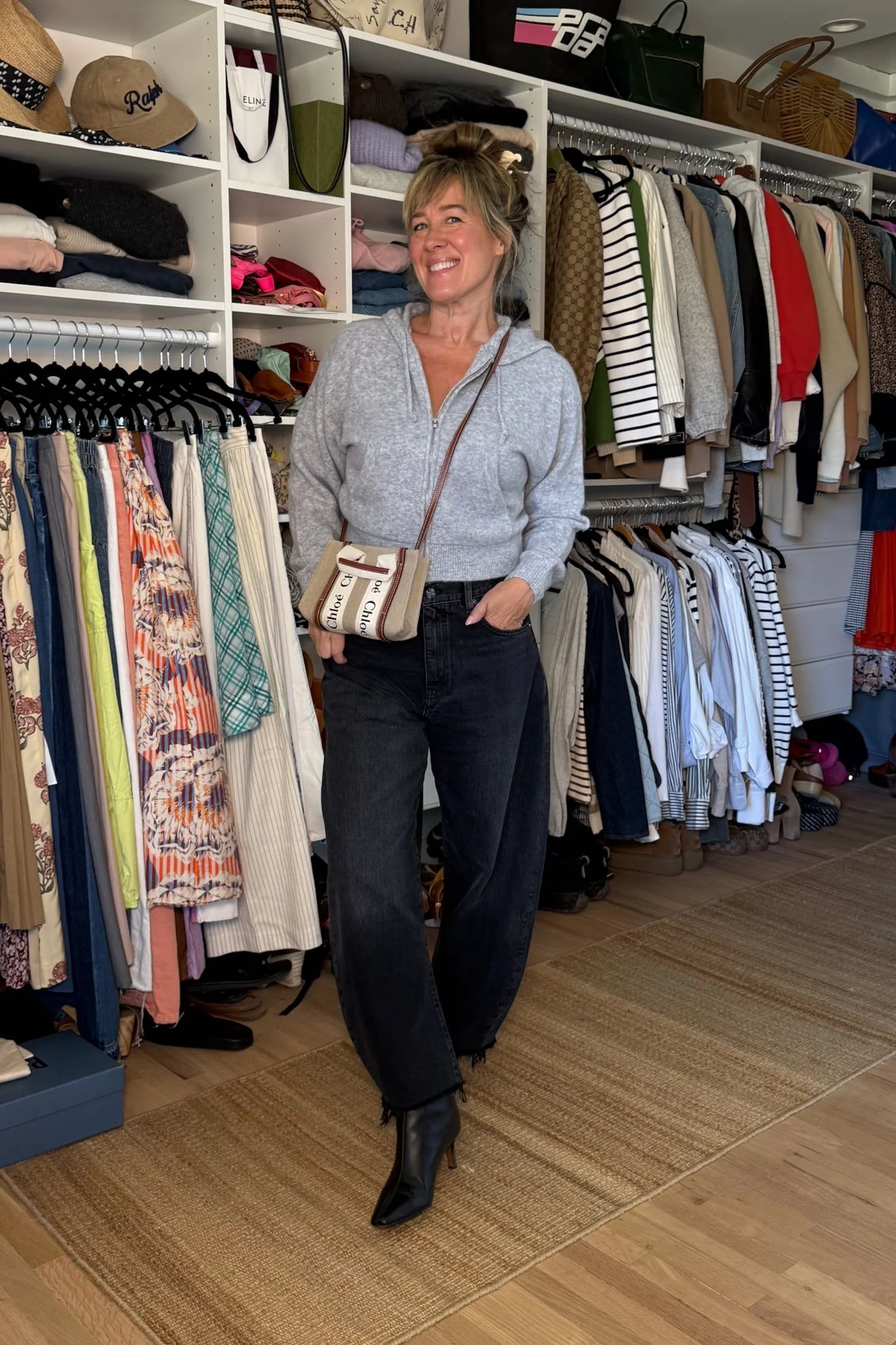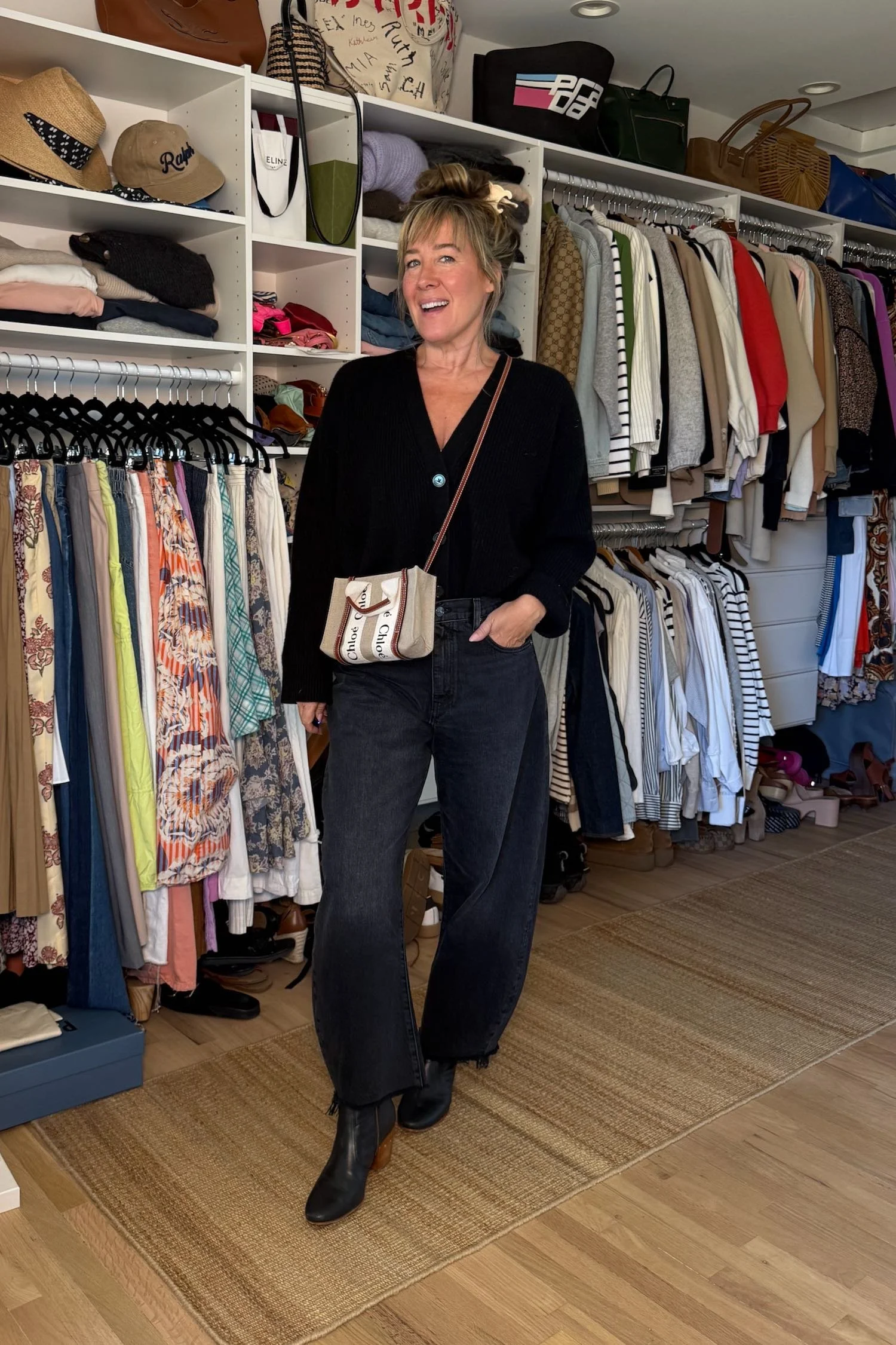 Black jeans are actually a must. I’ve recently learned this. And these barrels* are superrrrrrb. The fit is beyond! Somehow even though they’re wide, they make me look … thin? And we have railed hard against the barrel in the past. See HERE. But we are big enough to admit we were wrong. See HERE. I tucked in THE viral cardigan we always write about, and added some splashes of brown with the boots* (which happen to be my favorite boots of all history and time because they have a small heel so they make me look tall but the comfort is absolutely unmatched) and the bag* sort of brings the black and brown together.
