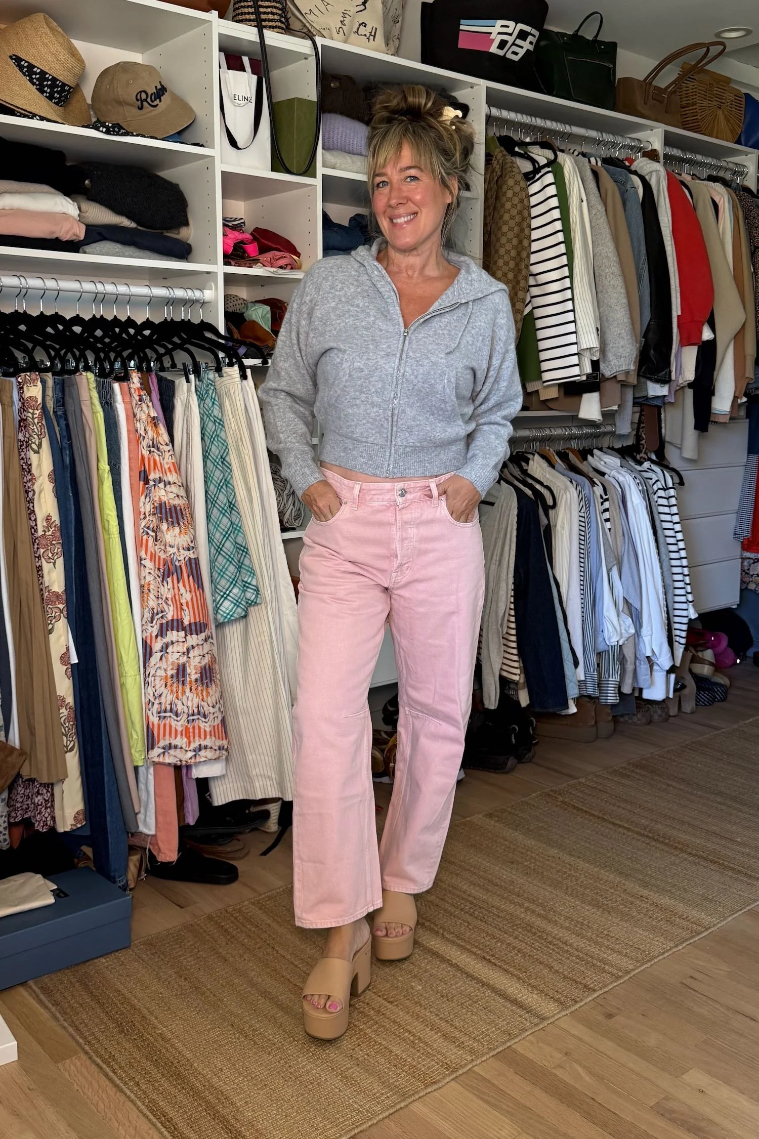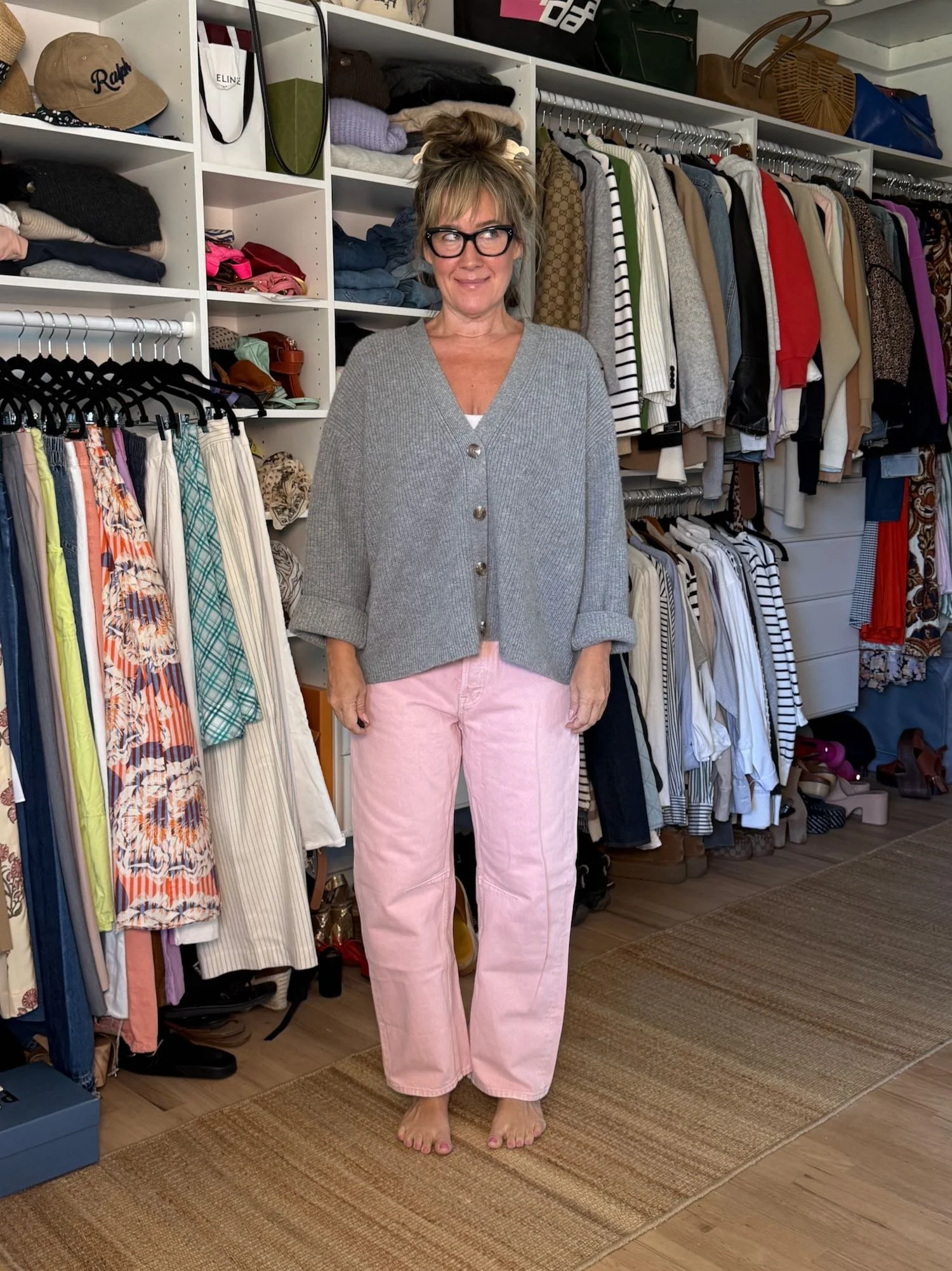 First, because the shape can tend to make us look squat, try to wear a shoe that’s roughly the same color palette or tone as the jeans. Second, since they’re very wide, we must do something more form fitting on top. This is that same not-cashmere-but-softer-and-better cardigan I talked about above and it’s perfect here. And lastly, the right pair of barrels is key. These* pink ones fit a bigger bum/smaller waist incredibly well, but my favorite fitting barrels of all time are…
