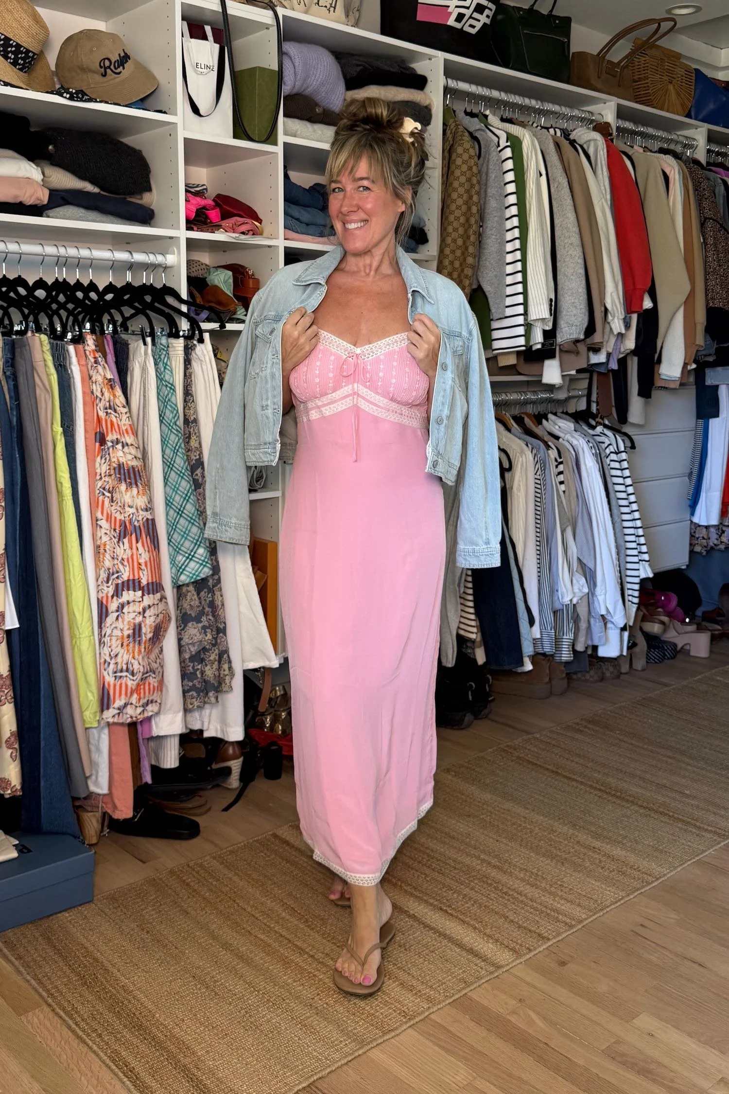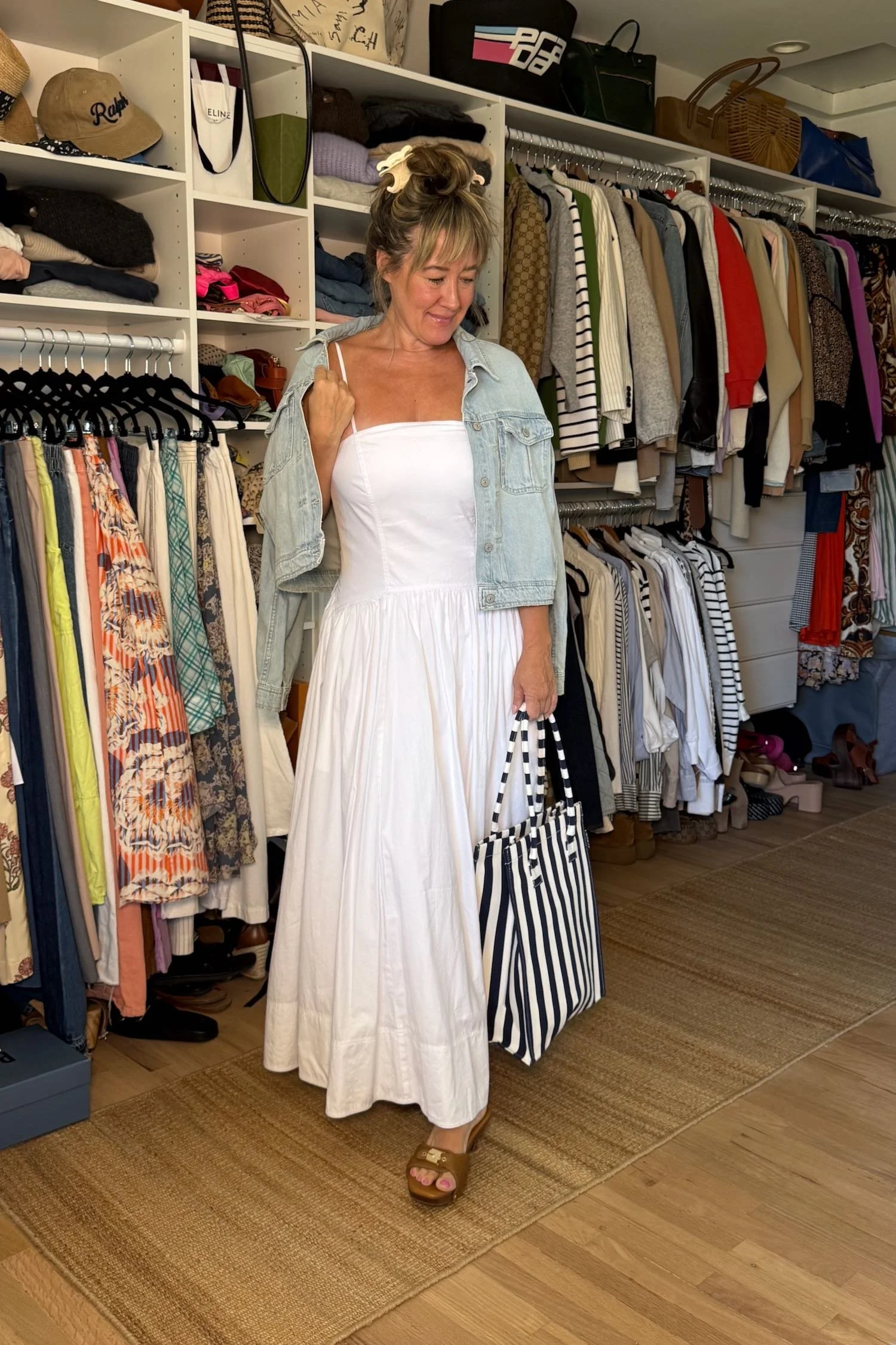 Why it works: This slip dress* is just so pretty and so flattering and so comfortable I forced myself to figure out how I could just wear it on a regular Wednesday. And this is what I came up with. Yes, there’s that perfectly cut denim jacket* again. And just some nude flips*! I stupidly didn’t show the straps on this dress but they’re whisper thin and gorgeous—and blessedly, I don’t need to wear a bra. Somehow the shape of the bust area is hoisty enough!