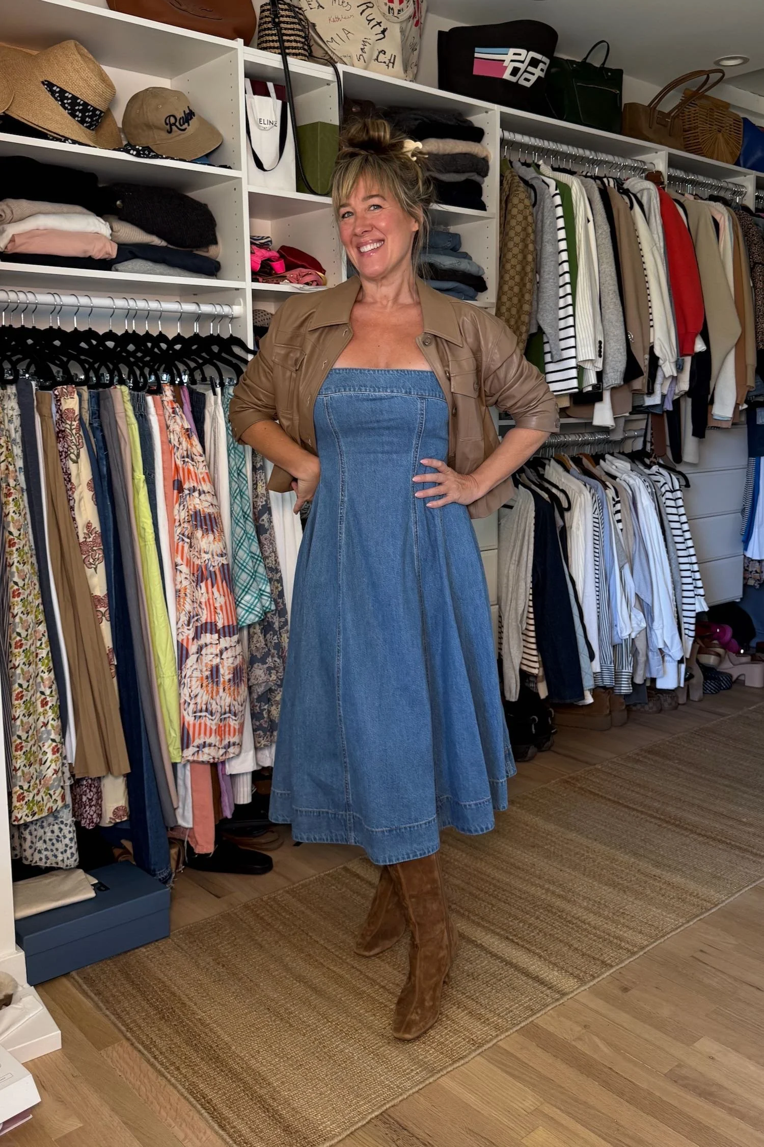 Why it works: Is there anything better than denim and side boots? I feel like maybe we all saw the same catalogue when we were all like 13 and somehow denim and suede boots created an indelible yearning all of us. I adore this happy and quirky flattering dress* but I realized I was “saving it” for special occasions so I swiftly created a cooler-weather look for it so that I can promptly wear it the moment the air turns even remotely crisp. The boots* are shockingly affordable. The exact leather jacket I’m wearing isn’t available anymore but we found its spitting image HERE* and at a not-too-bad price for genuine leather.