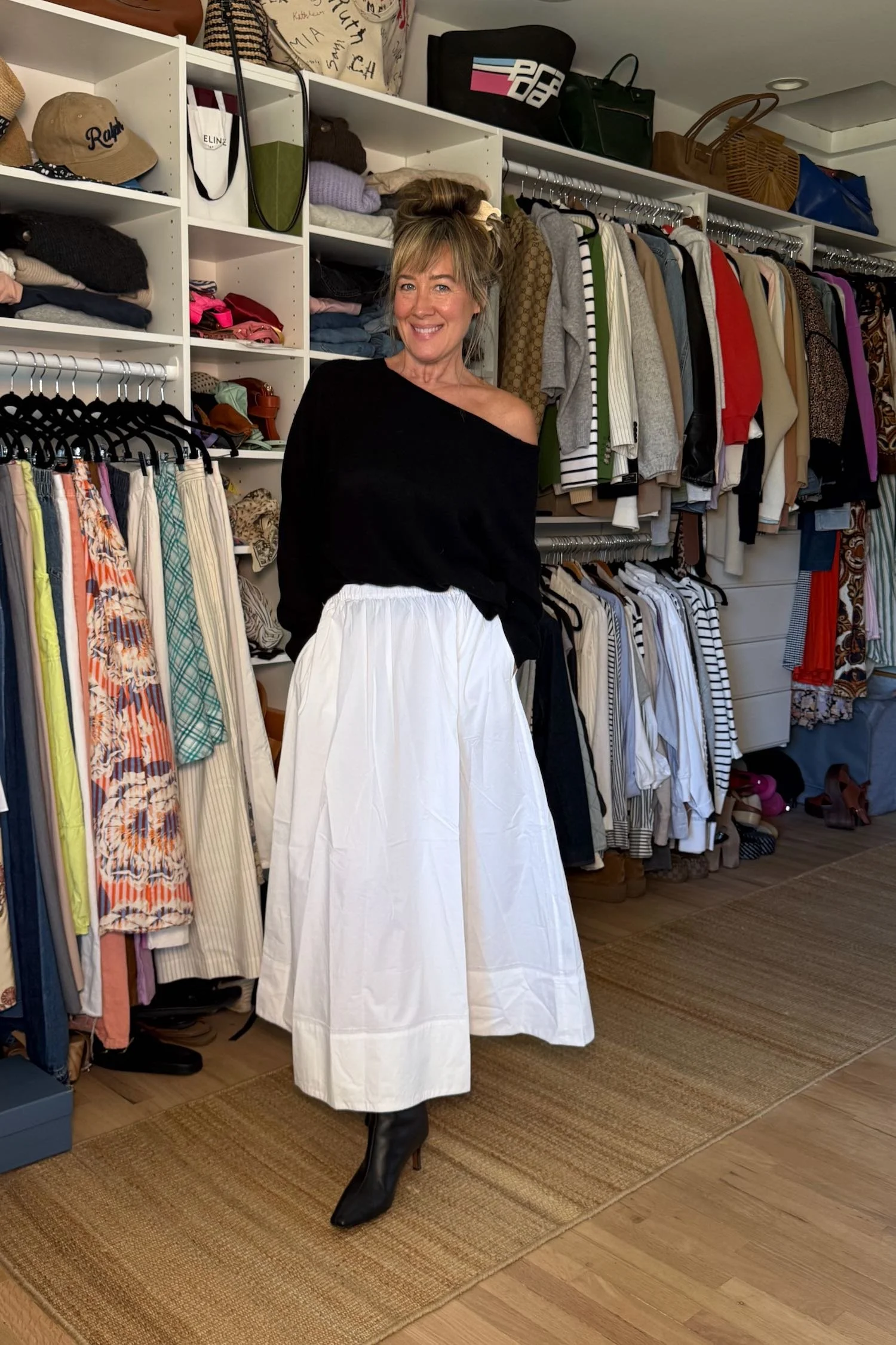 Why it works: I’m wearing this floaty white skirt* with an insanely affordable cashmere boatneck* that I sort of hoist down to force it into off-shoulder submission. I threw on those boots* I talked about that have a lovely sleekness but are so walkable, and poof, it’s an outfit fit for a lady, except I feel like I’m in house clothes.