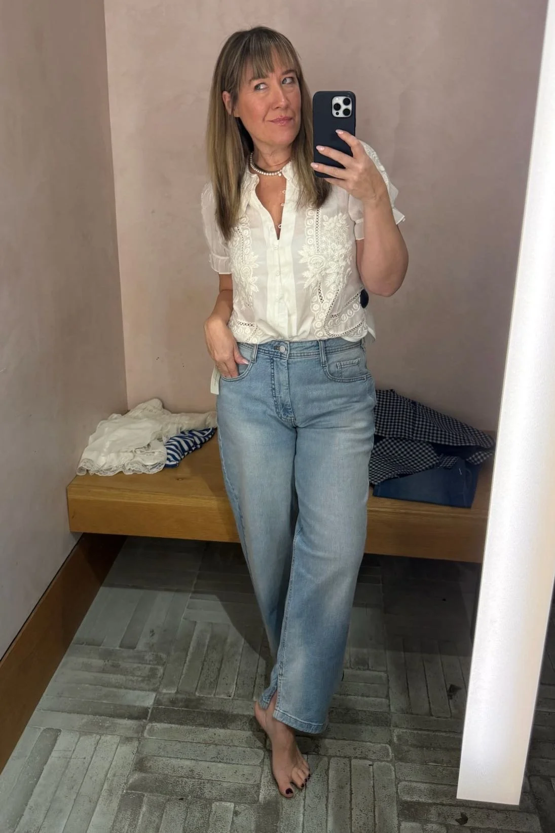We’ve written about the complexity of barrel jeans HERE and about our realization that we were mostly wrong about them HERE, but if you have a long torso, these will slice you right in the hoo-ha. But that that top* is truly dreamy, and I bought it.